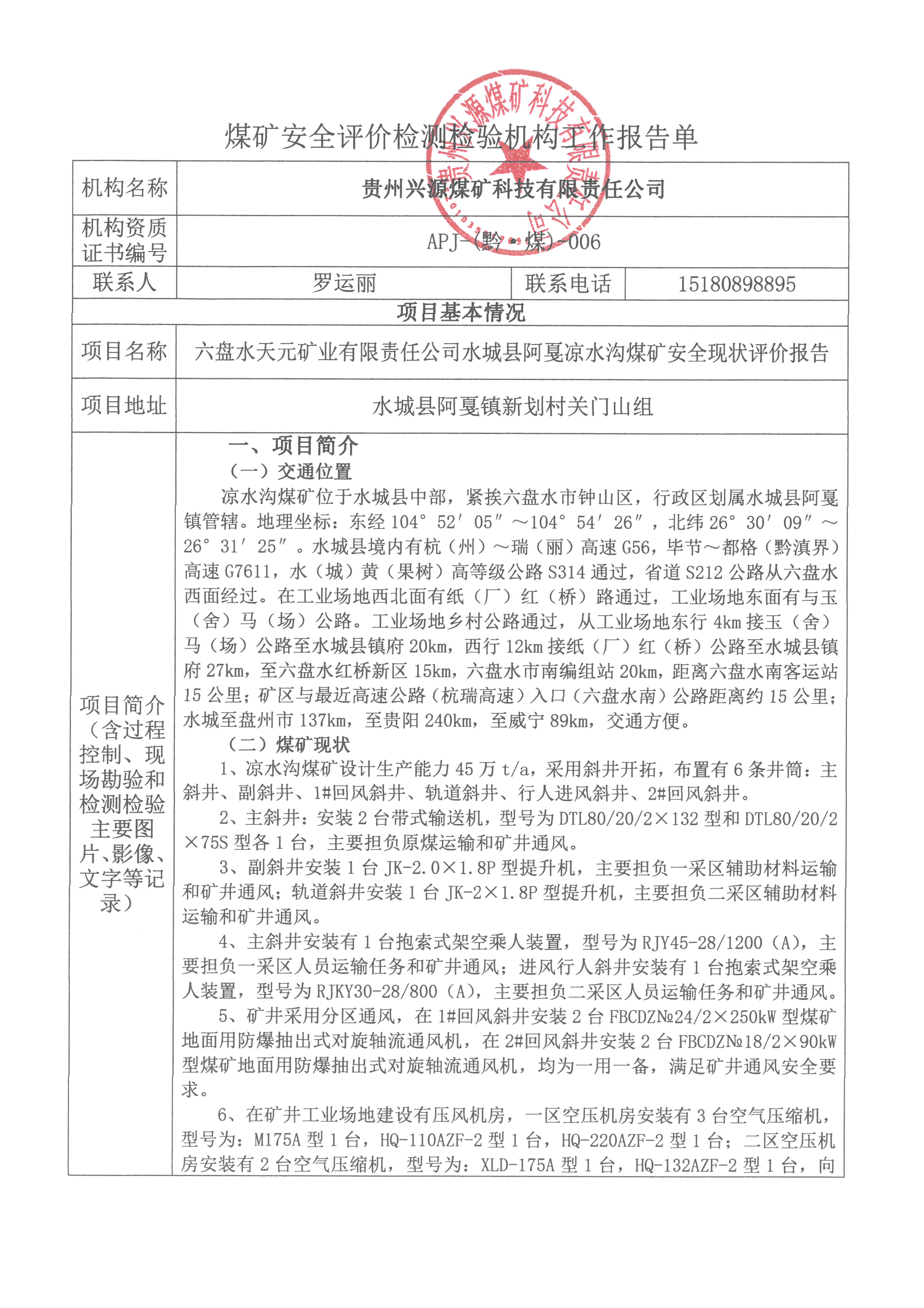 煤礦安全評價檢測檢驗機構工作報告單【六盤水天元礦業有限責任公司水城縣阿戛涼水溝煤礦安全現狀評價報告】