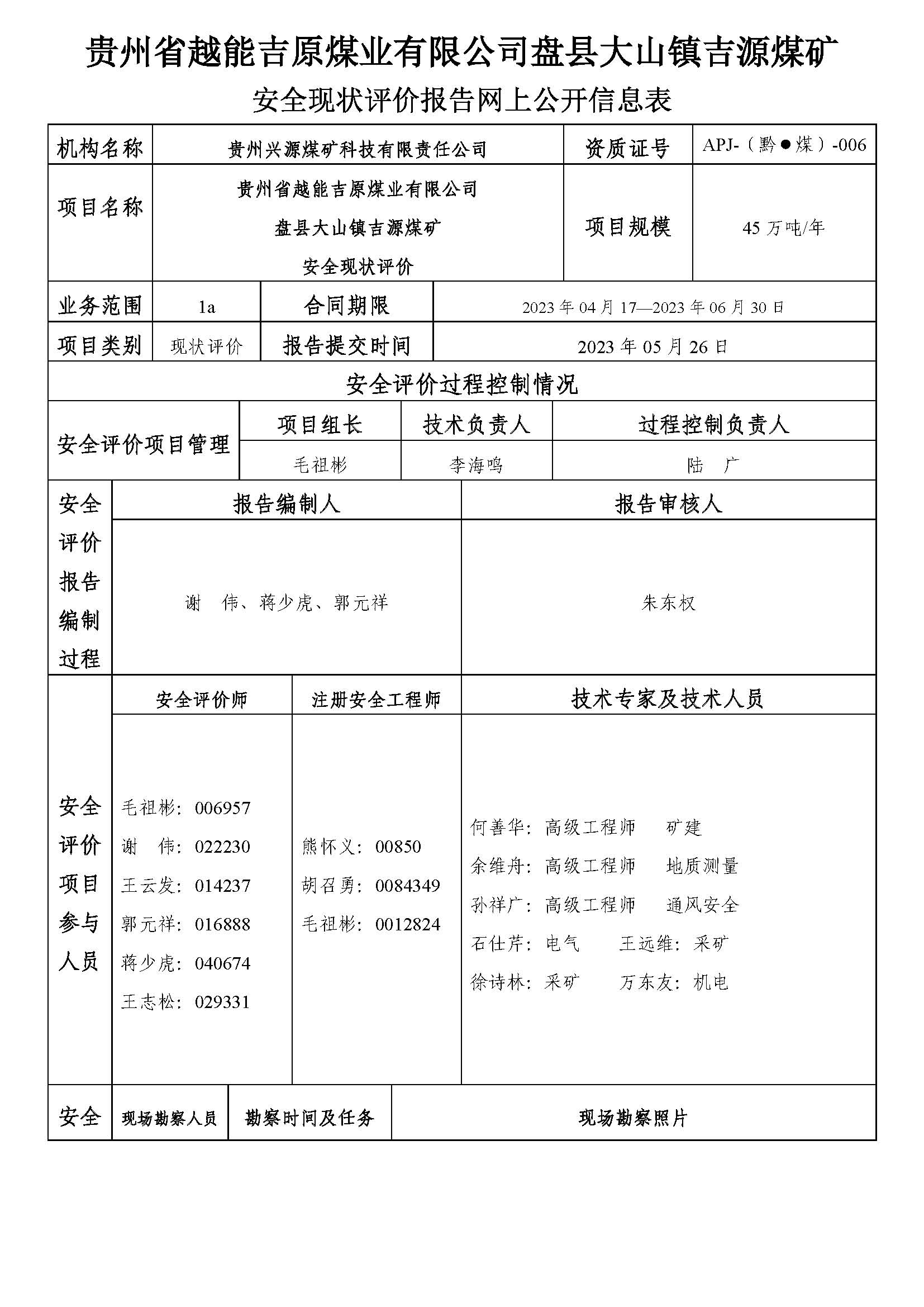 貴州省越能吉原煤業有限公司盤縣大山鎮吉源煤礦安全現狀評價報告網上公開信息表