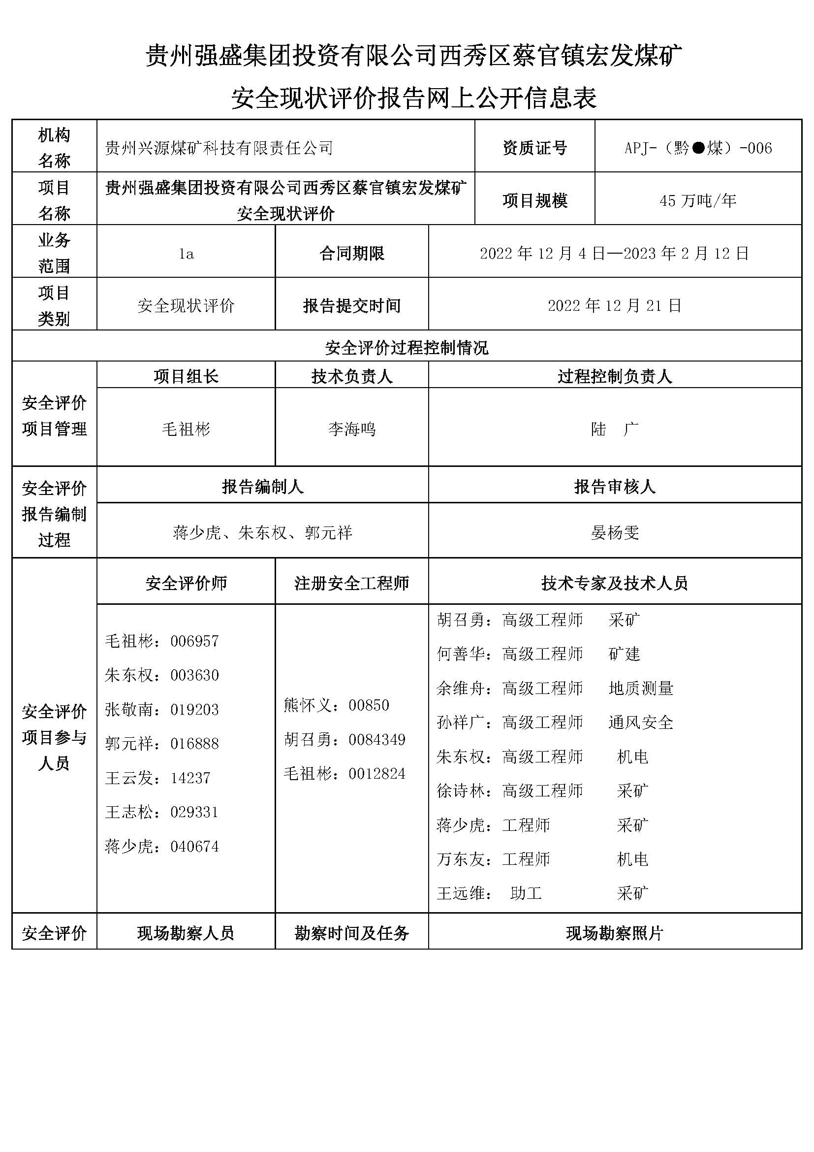 貴州強(qiáng)盛集團(tuán)投資有限公司西秀區(qū)蔡官鎮(zhèn)宏發(fā)煤礦安全現(xiàn)狀評(píng)價(jià)報(bào)告網(wǎng)上公開信息表