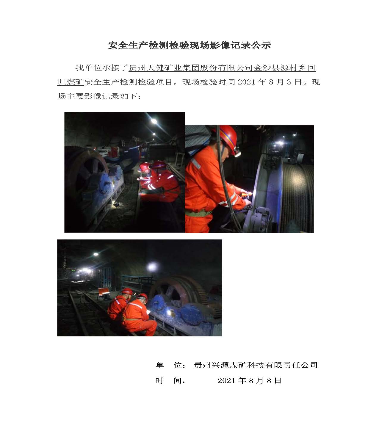 安全生產檢測檢驗現場影像記錄公示【貴州天健礦業集團股份有限公司金沙縣源村鄉回歸煤礦】