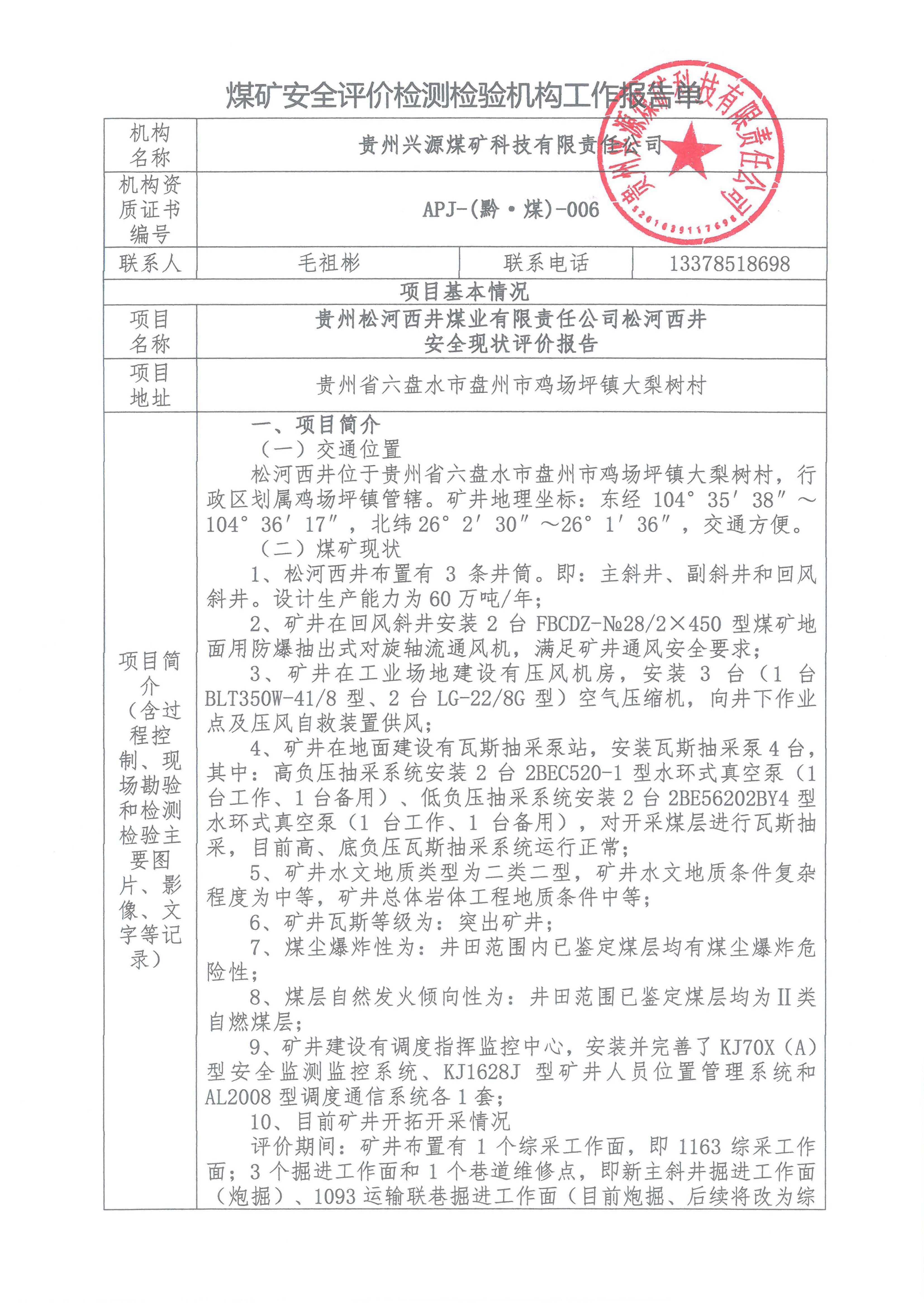 煤礦安全評價檢測檢驗機構工作報告單【貴州松河西井煤業有限責任公司松河西井 安全現狀評價報告】