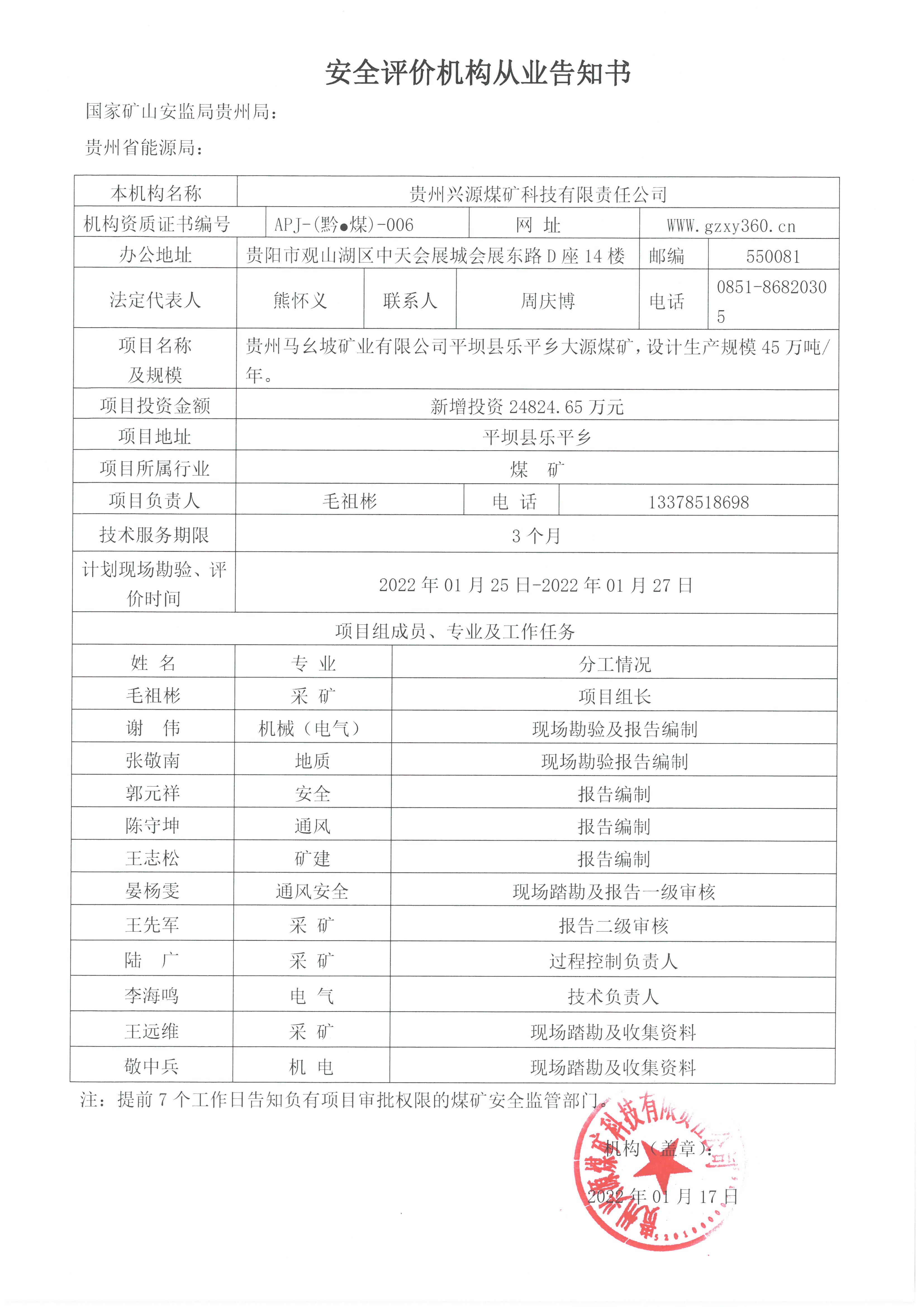 安全評價機構從業告知書(貴州馬幺坡礦業有限公司平壩縣樂平鄉大源煤礦)