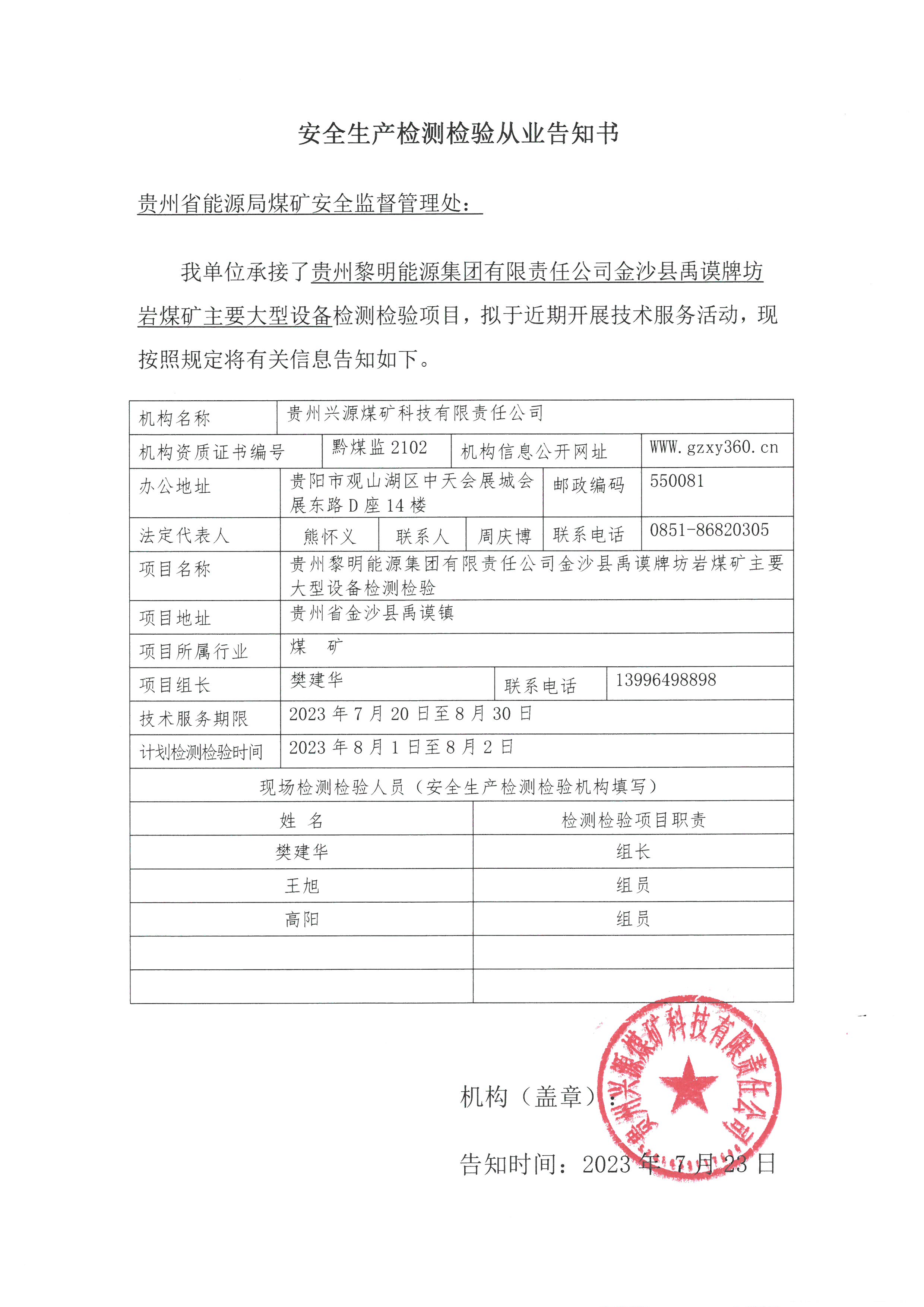 安全生產檢測檢驗從業告知書【貴州黎明能源集團有限責任公司金沙縣禹謨牌坊巖】