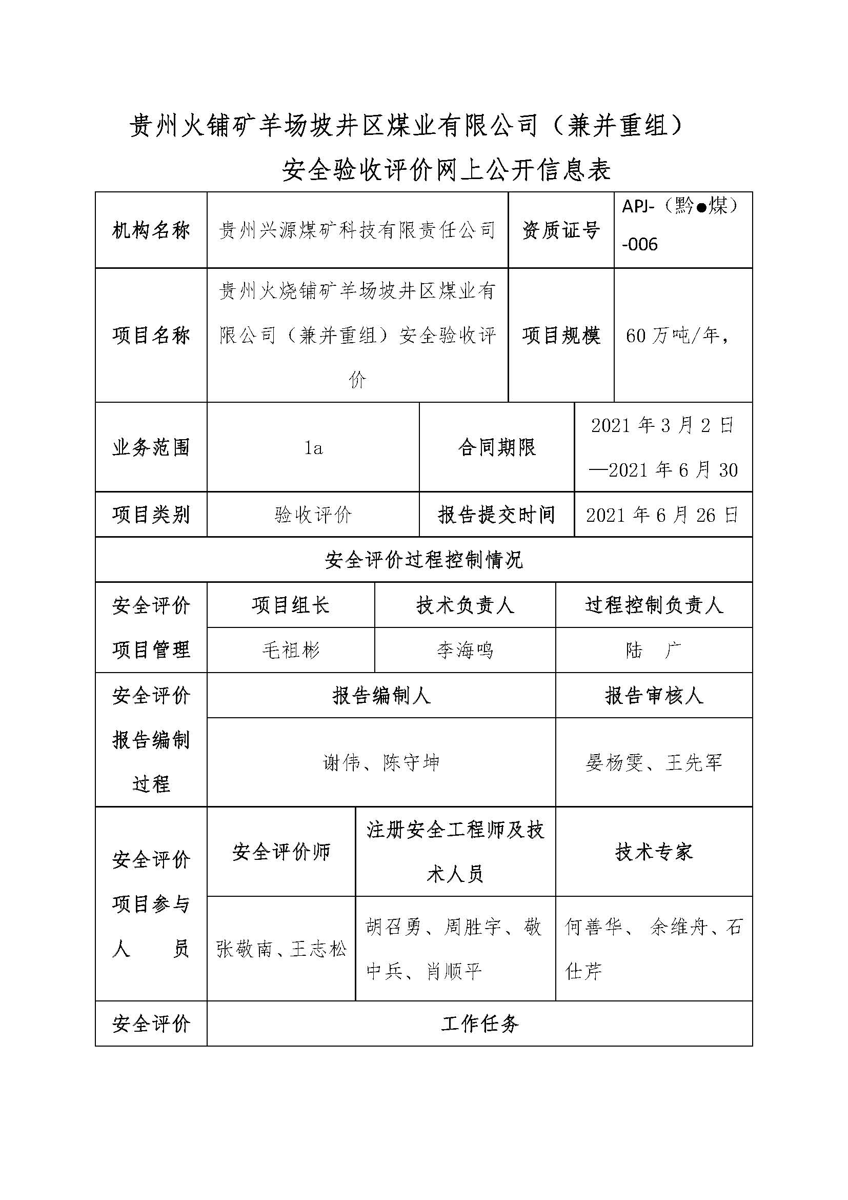 貴州火鋪礦羊場坡井區(qū)煤業(yè)有限公司(兼并重組)安全驗收評價網(wǎng)上公開信息表