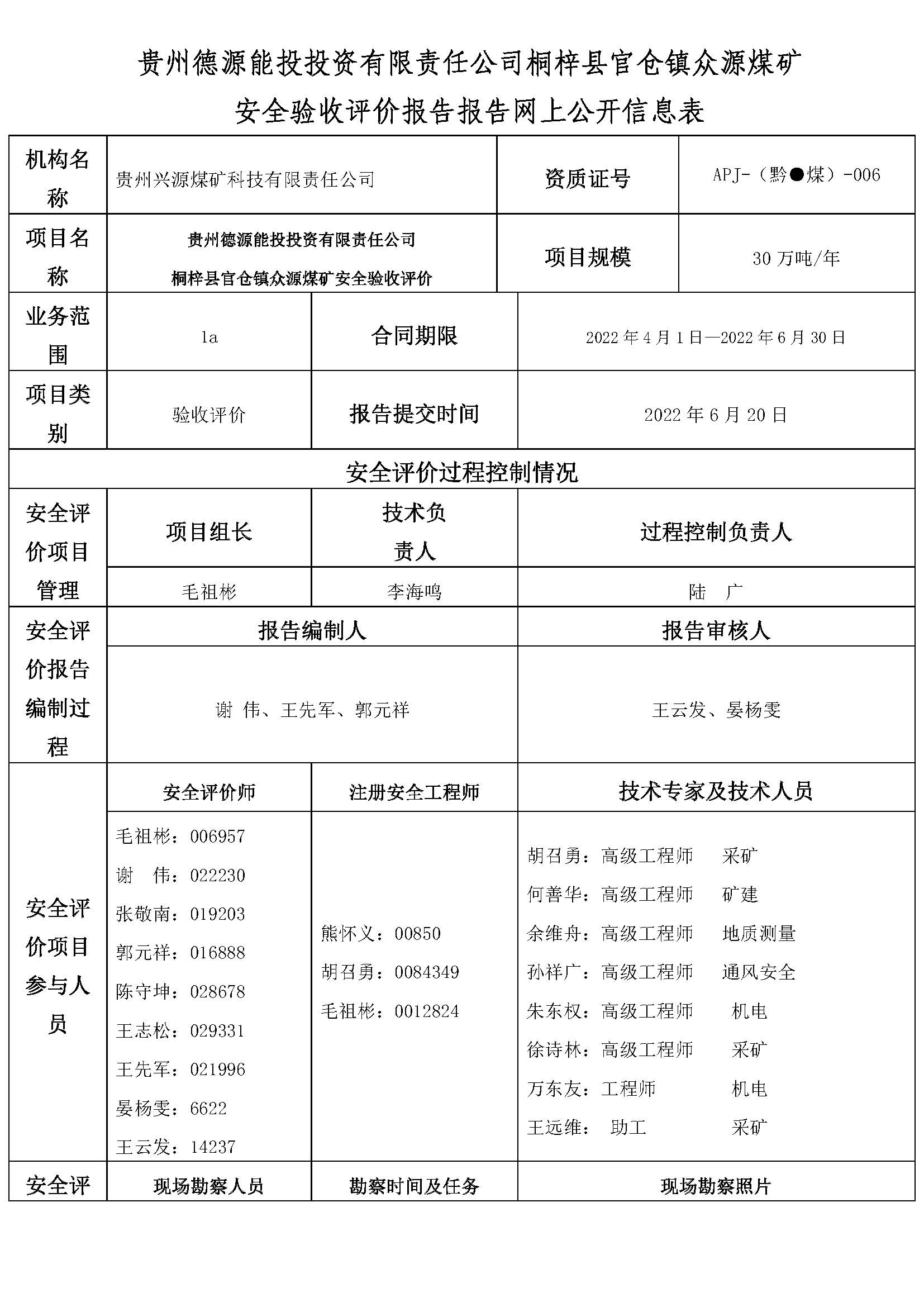 貴州德源能投投資有限責(zé)任公司桐梓縣官倉鎮(zhèn)眾源煤礦安全驗收評價報告報告網(wǎng)上公開信息表