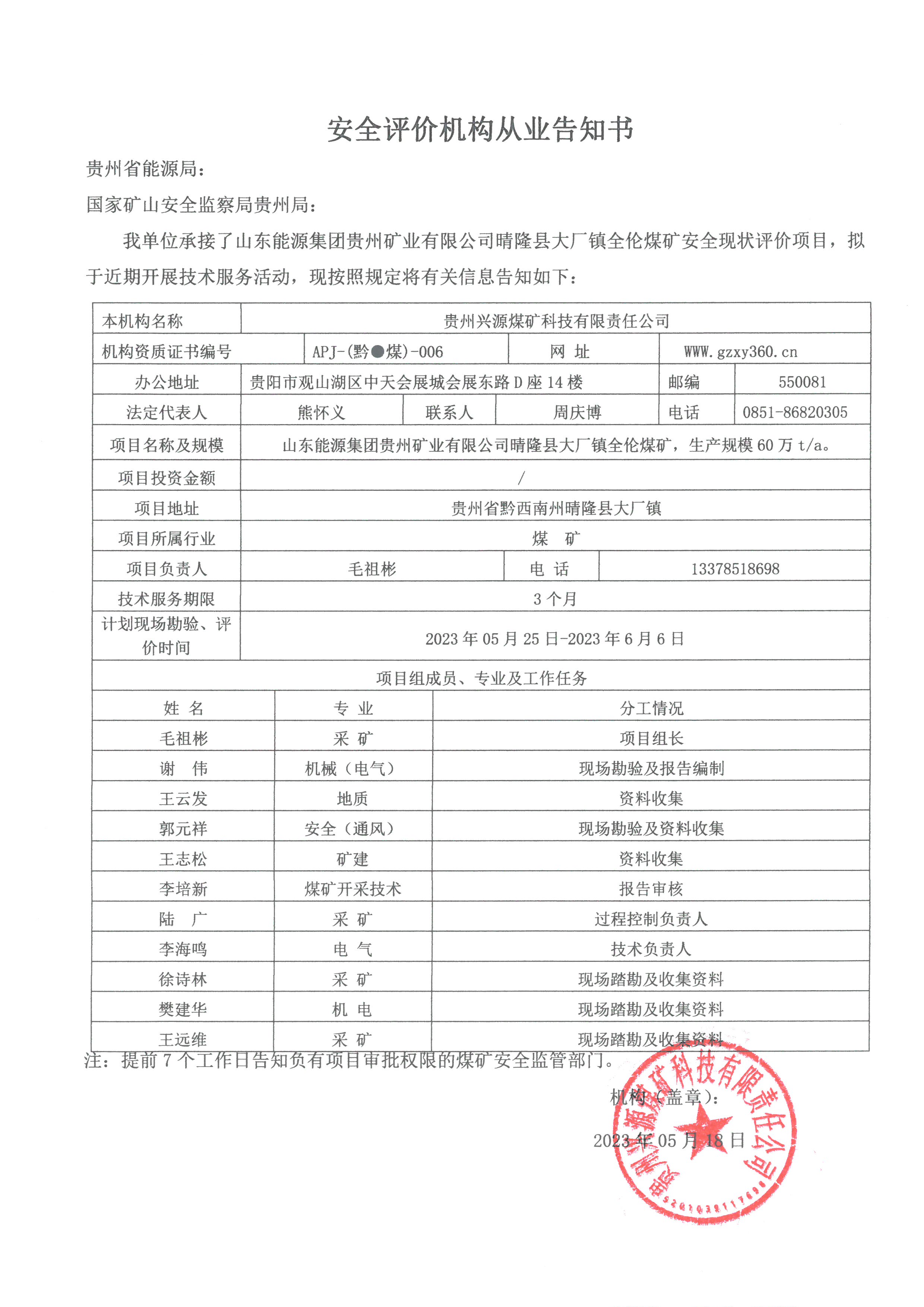 安全評價機構從業告知書【山東能源集團貴州礦業有限公司晴隆縣大廠鎮全倫煤礦安全現狀評價項目】