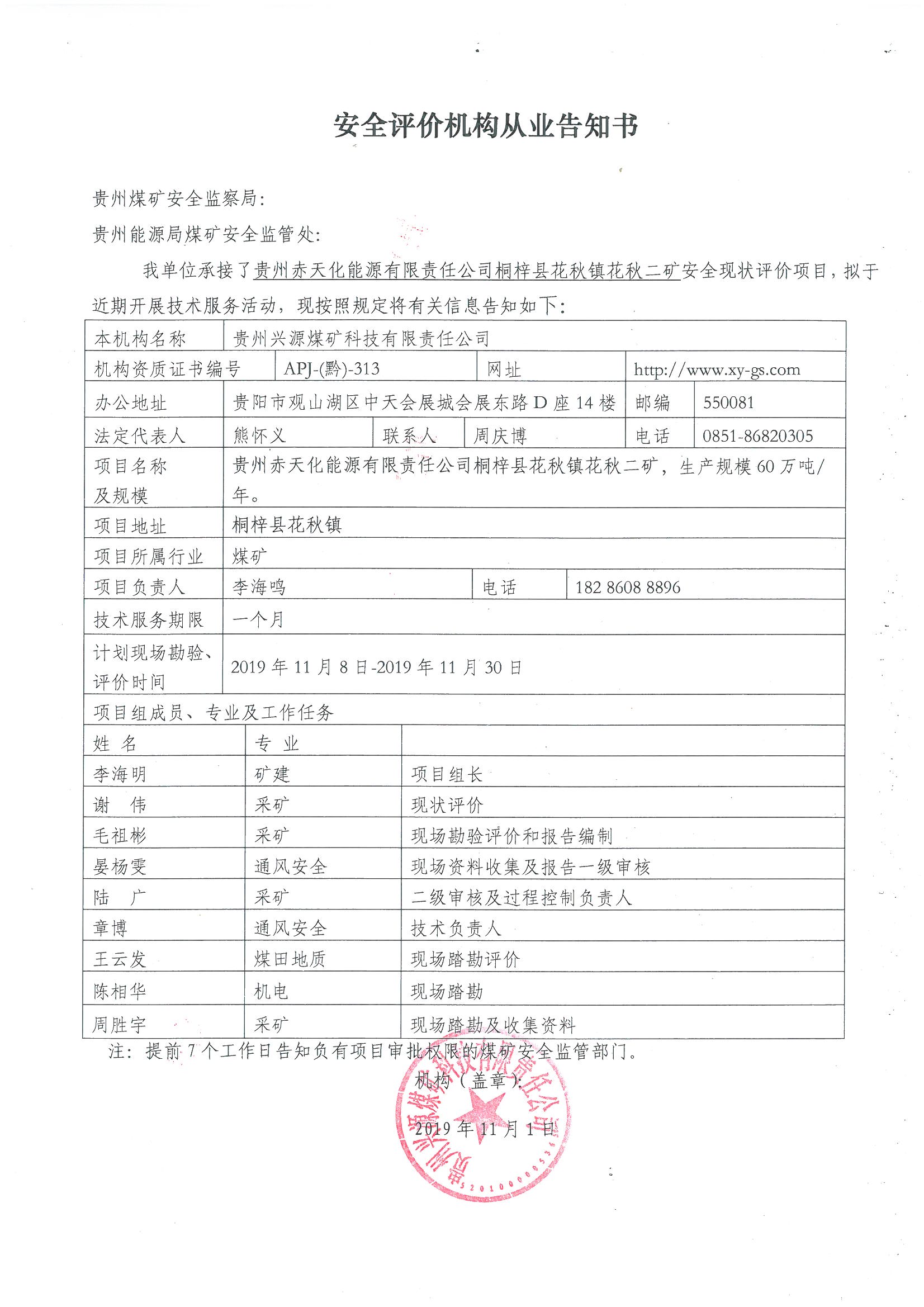安全評價機構從業告知書[貴州赤天化能源有限責任公司桐梓縣花秋鎮花秋二礦]