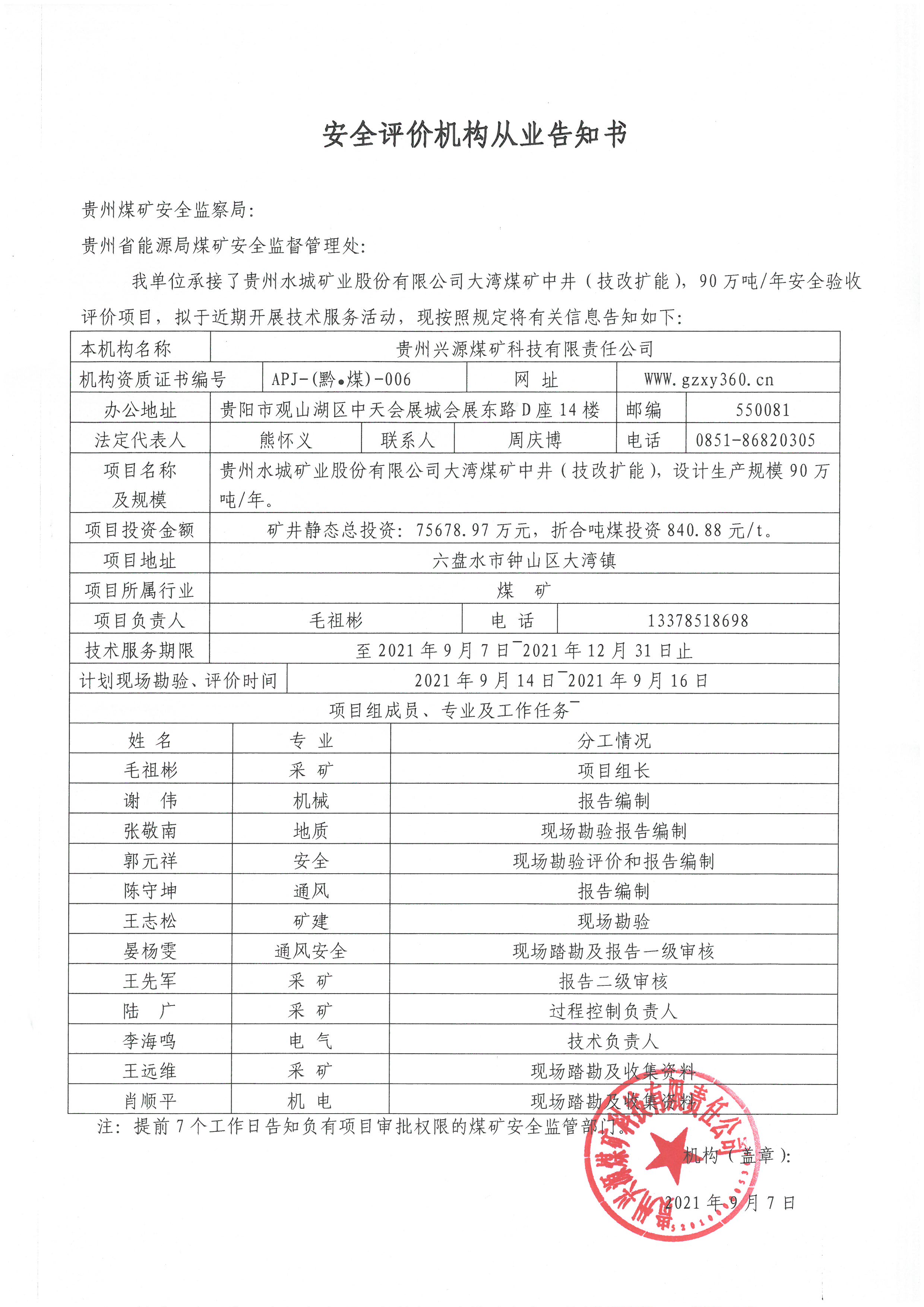 安全評價機構從業告知書(貴州水城礦業股份有限公司大灣煤礦中井(技改擴能)90萬噸年安全驗收評價)