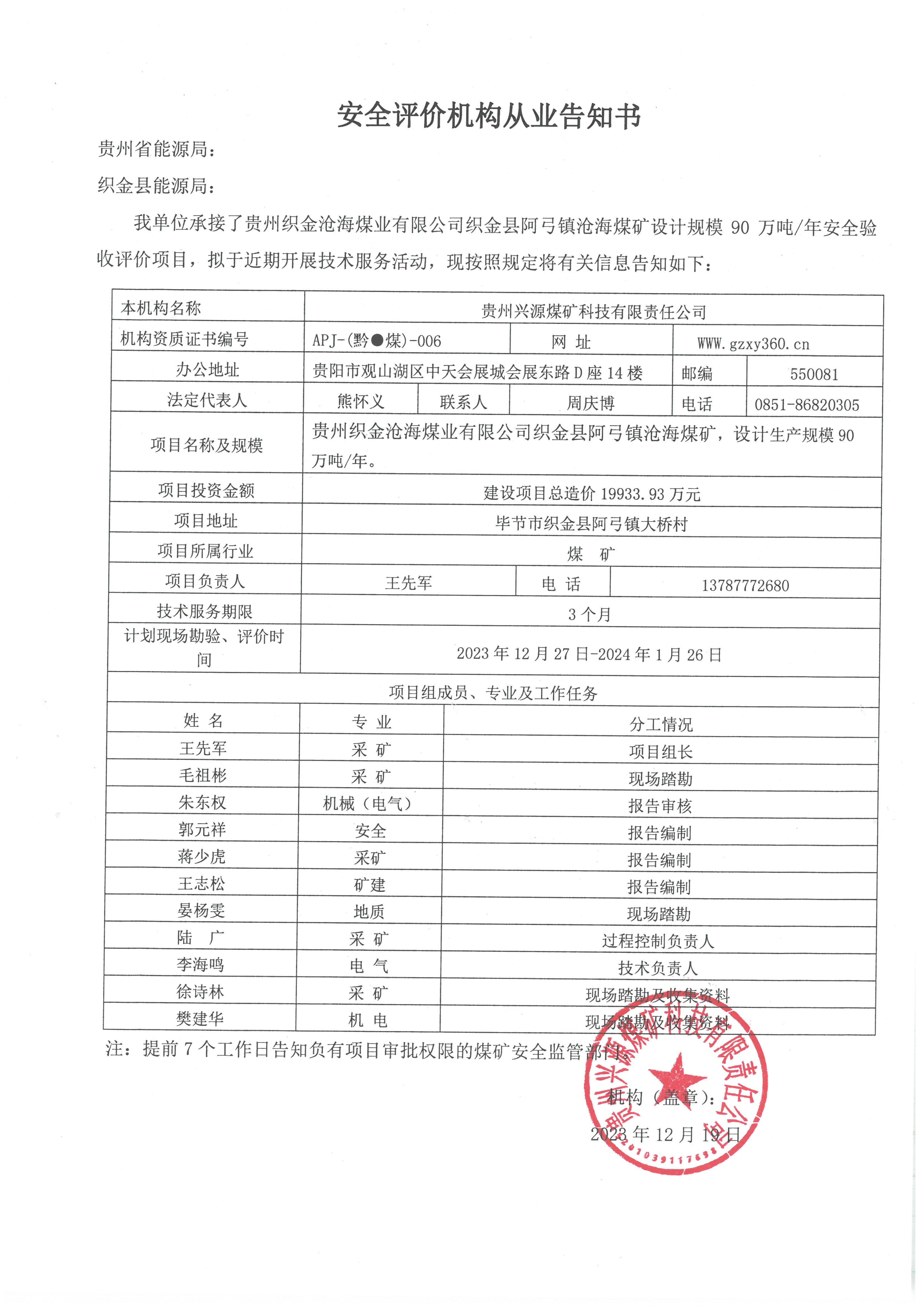安全評價機構從業告知書【貴州織金滄海煤業有限公司織金縣阿弓鎮滄海煤礦】