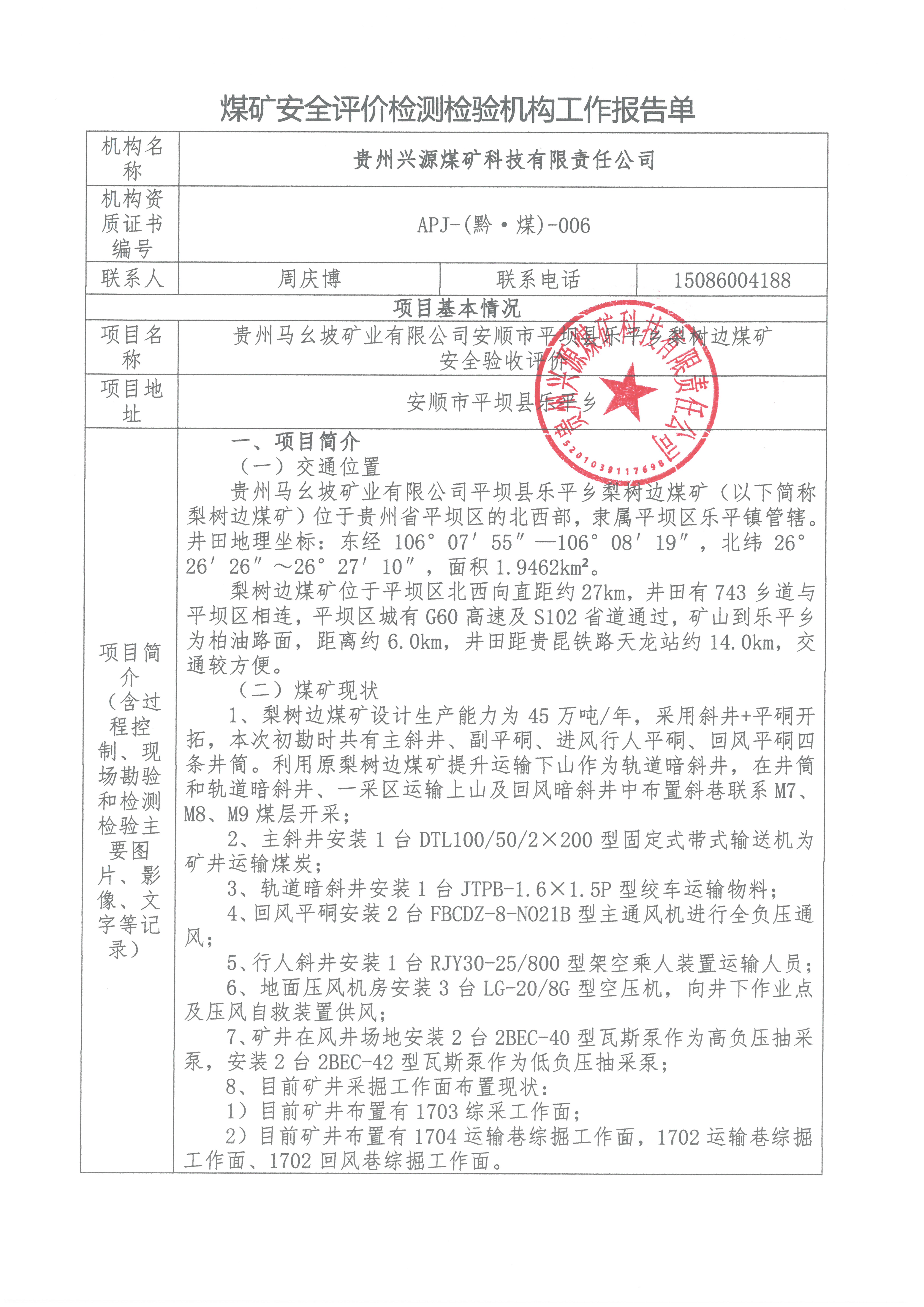 煤礦安全評價檢測檢驗機構工作報告單【貴州馬幺坡礦業(yè)有限公司安順市平壩縣樂平鄉(xiāng)梨樹邊煤礦 安全驗收評價】