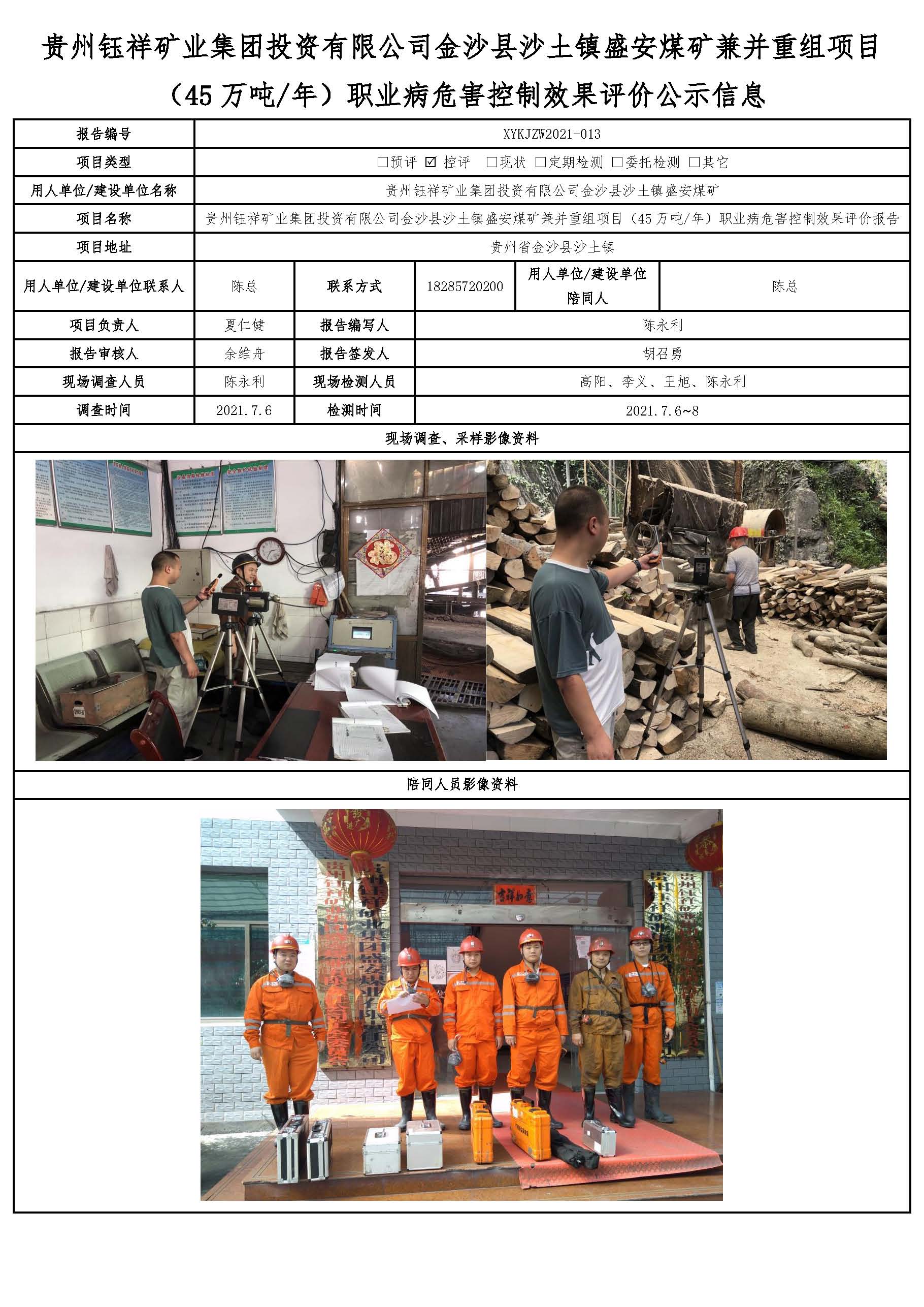 貴州鈺祥礦業集團投資有限公司金沙縣沙土鎮盛安煤礦兼并重組項目(45萬噸/年)職業病危害控制效果評價公示信息