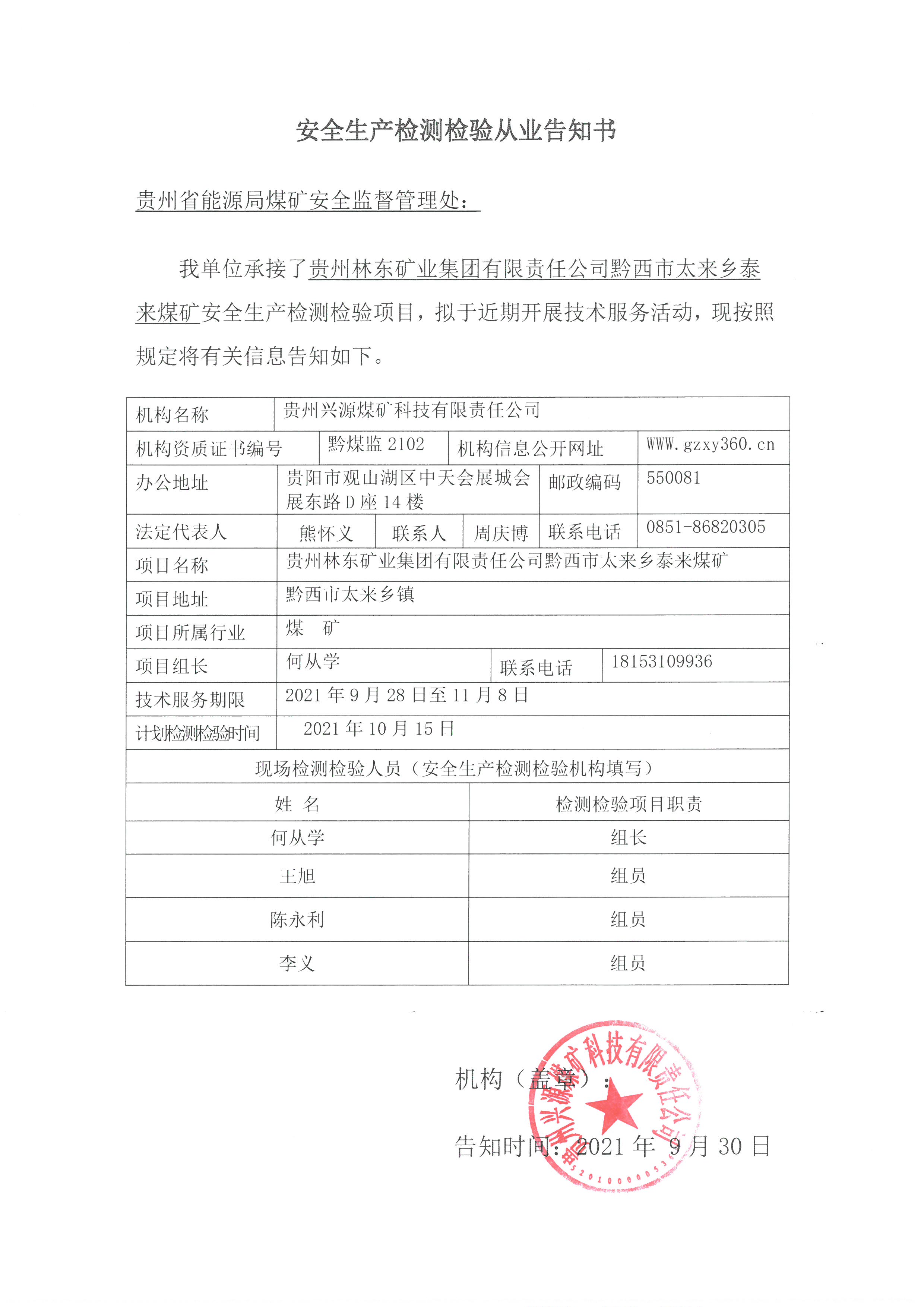 安全生產檢測檢驗從業告知書【貴州林東礦業集團有限責任公司黔西市太來鄉泰來煤礦】