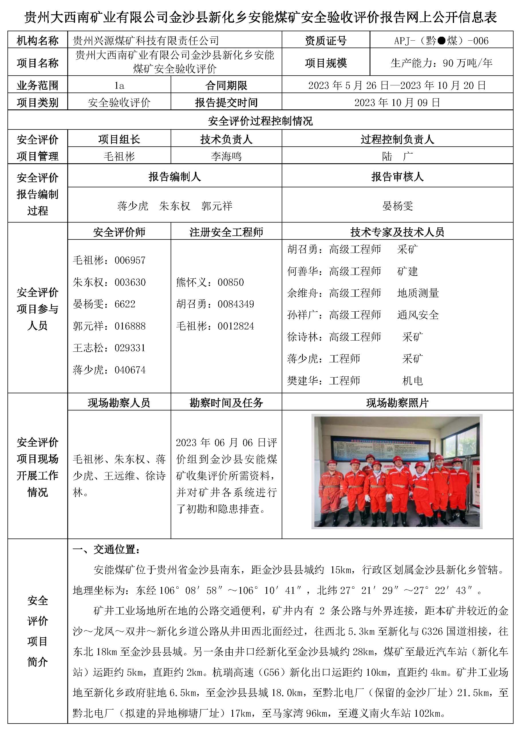 貴州大西南礦業(yè)有限公司金沙縣新化鄉(xiāng)安能煤礦安全驗(yàn)收評(píng)價(jià)報(bào)告網(wǎng)上公開信息表