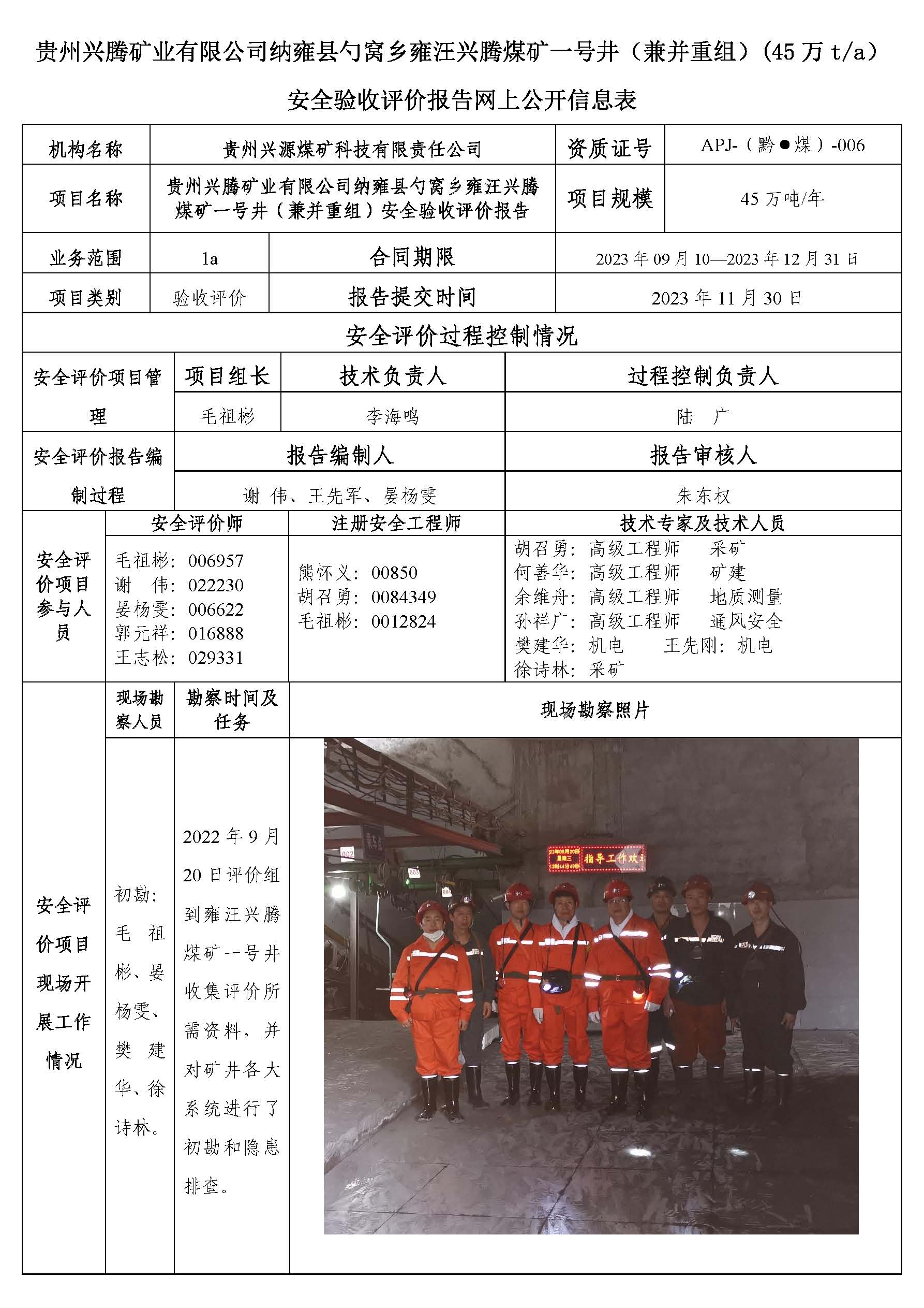 貴州興騰礦業(yè)有限公司納雍縣勺窩鄉(xiāng)雍汪興騰煤礦一號(hào)井(兼并重組)(45萬(wàn)t/a)安全驗(yàn)收評(píng)價(jià)報(bào)告網(wǎng)上公開(kāi)信息表