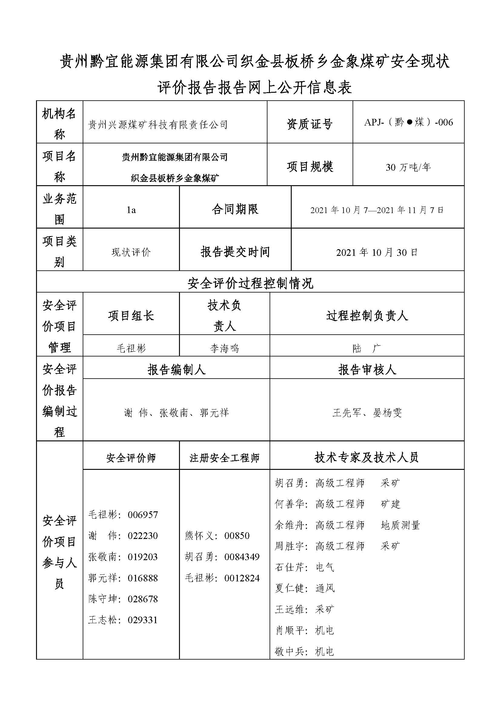 貴州黔宜能源集團有限公司織金縣板橋鄉金象煤礦安全現狀評價報告報告網上公開信息表