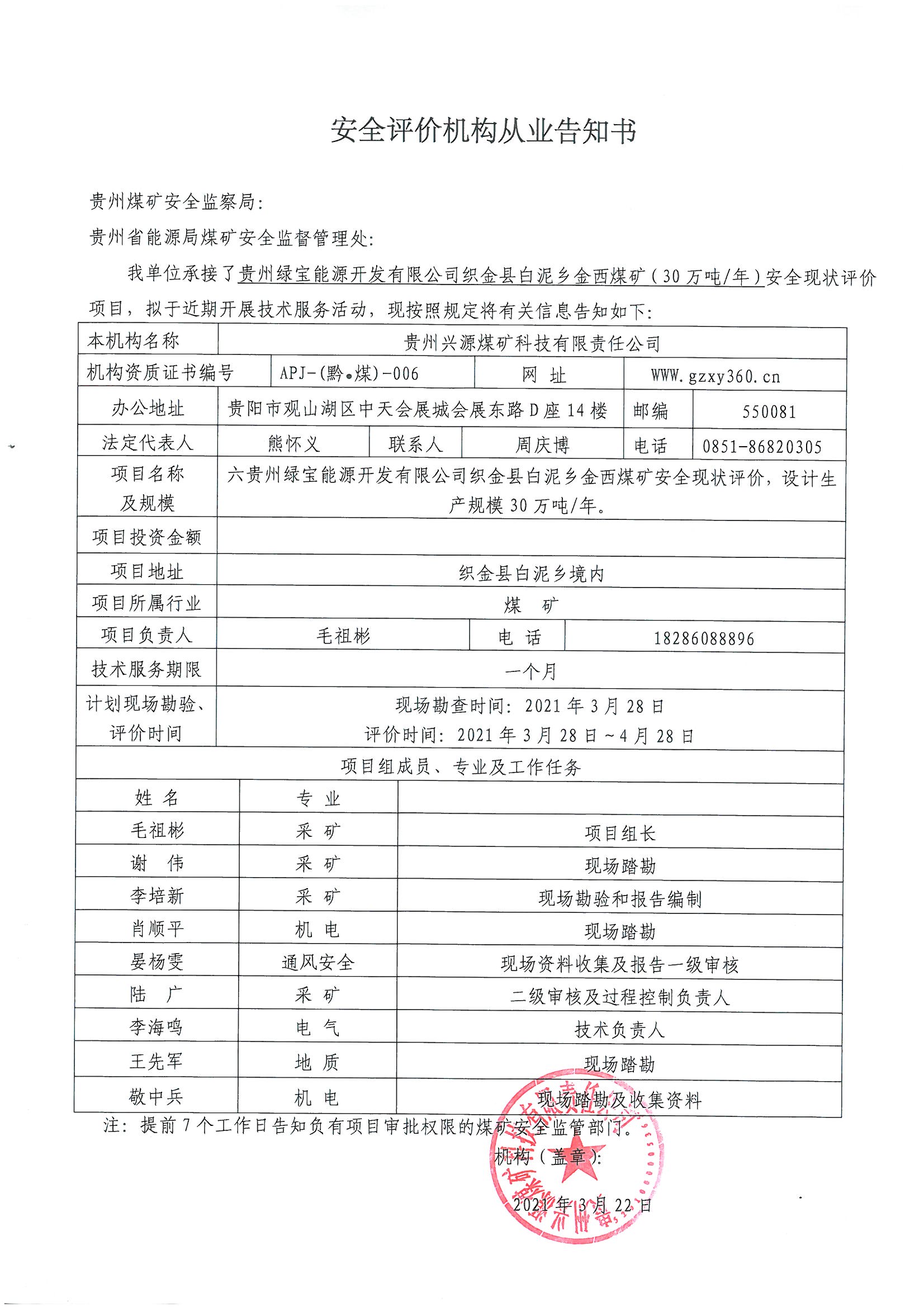 安全評價機構從業告知書(貴州綠寶能源開發有限公司織金縣白泥鄉金西煤礦)