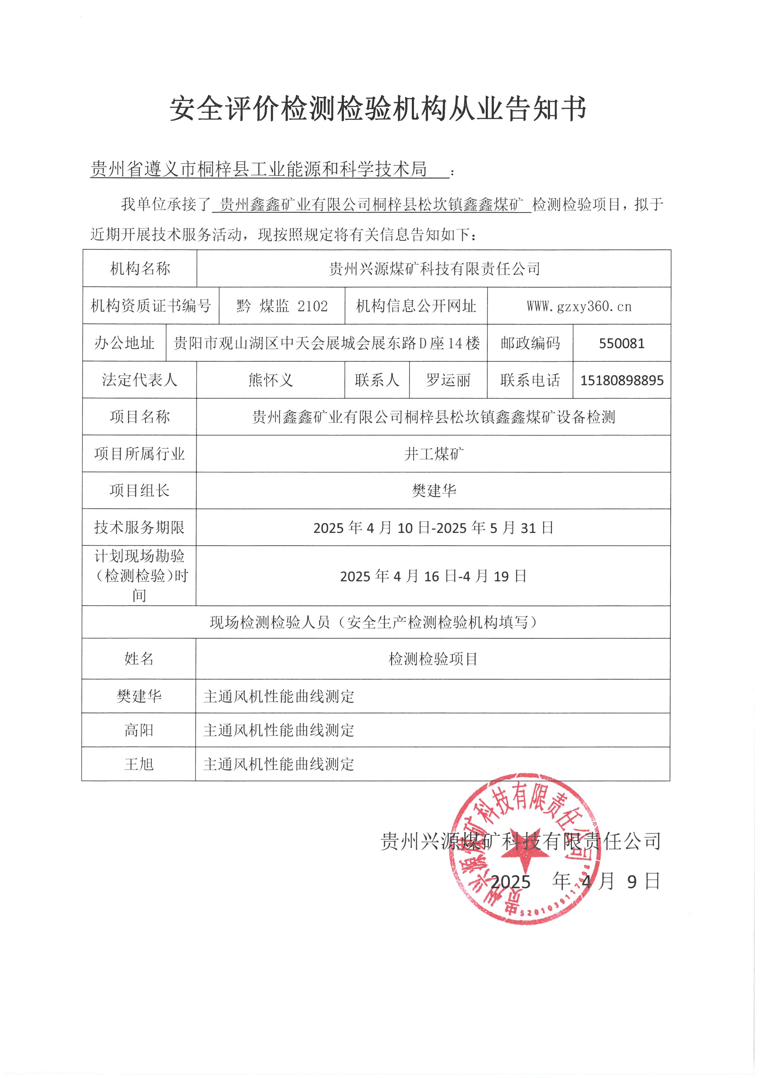 安全評價檢測檢驗機構從業告知書【貴州鑫鑫礦業有限公司桐梓縣松坎鎮鑫鑫煤礦】