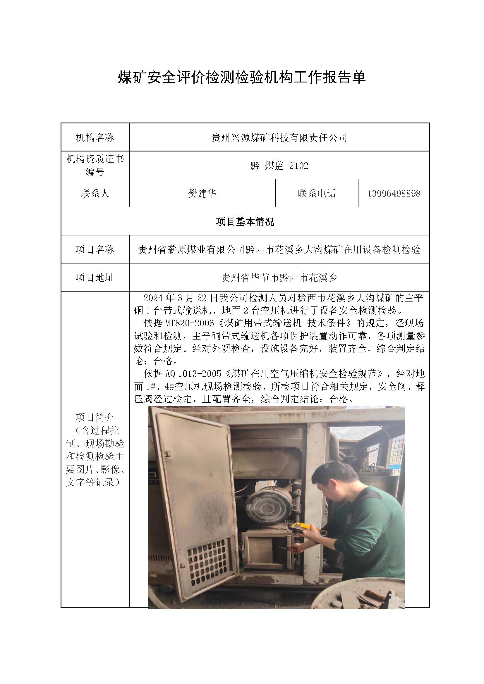 煤礦安全評價檢測檢驗機構工作報告單【貴州省薪原煤業有限公司黔西市花溪鄉大溝煤礦在用設備檢測檢驗】