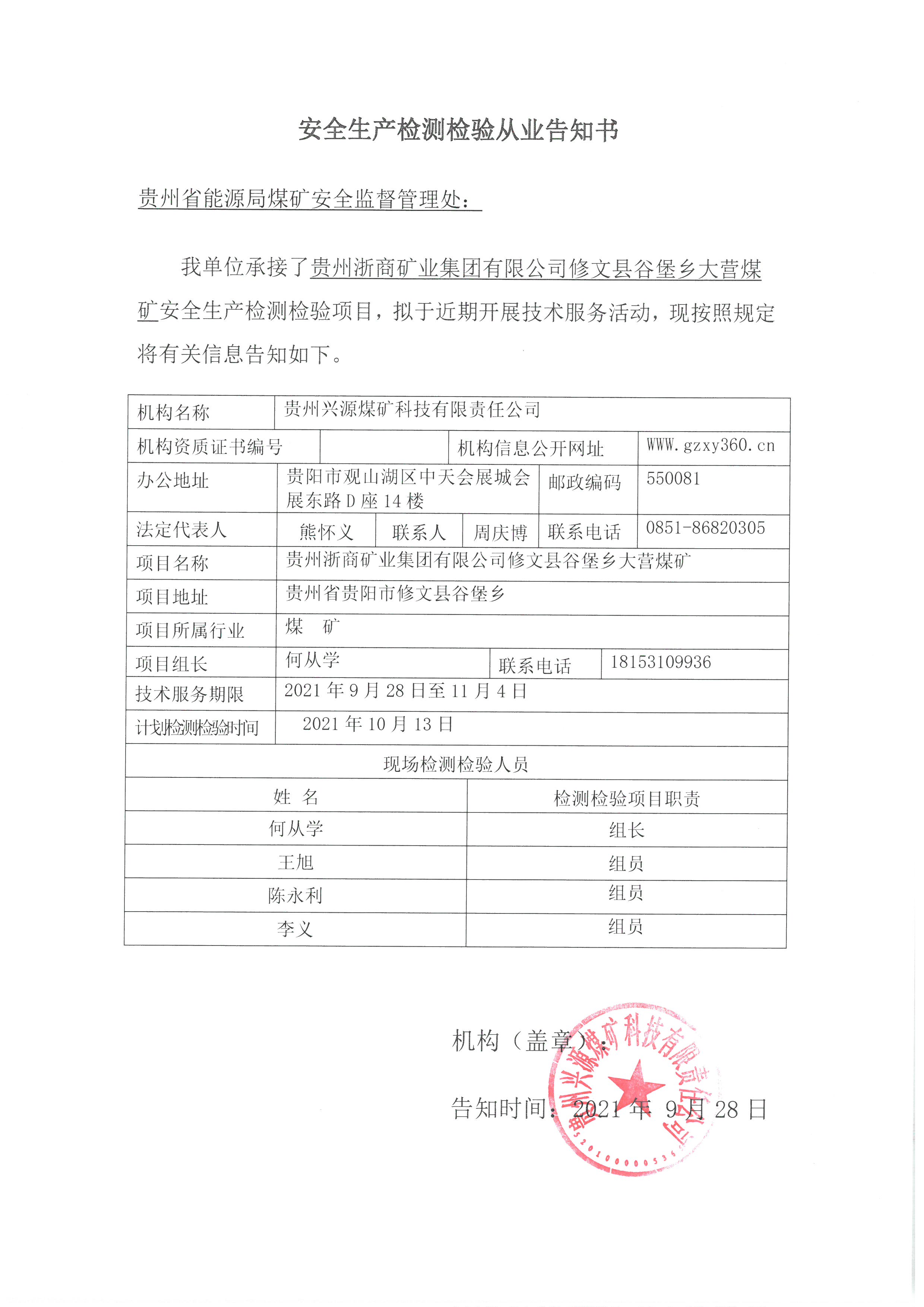 安全生產(chǎn)檢測檢驗從業(yè)告知書【貴州浙商礦業(yè)集團有限公司修文縣谷堡鄉(xiāng)大營煤礦】