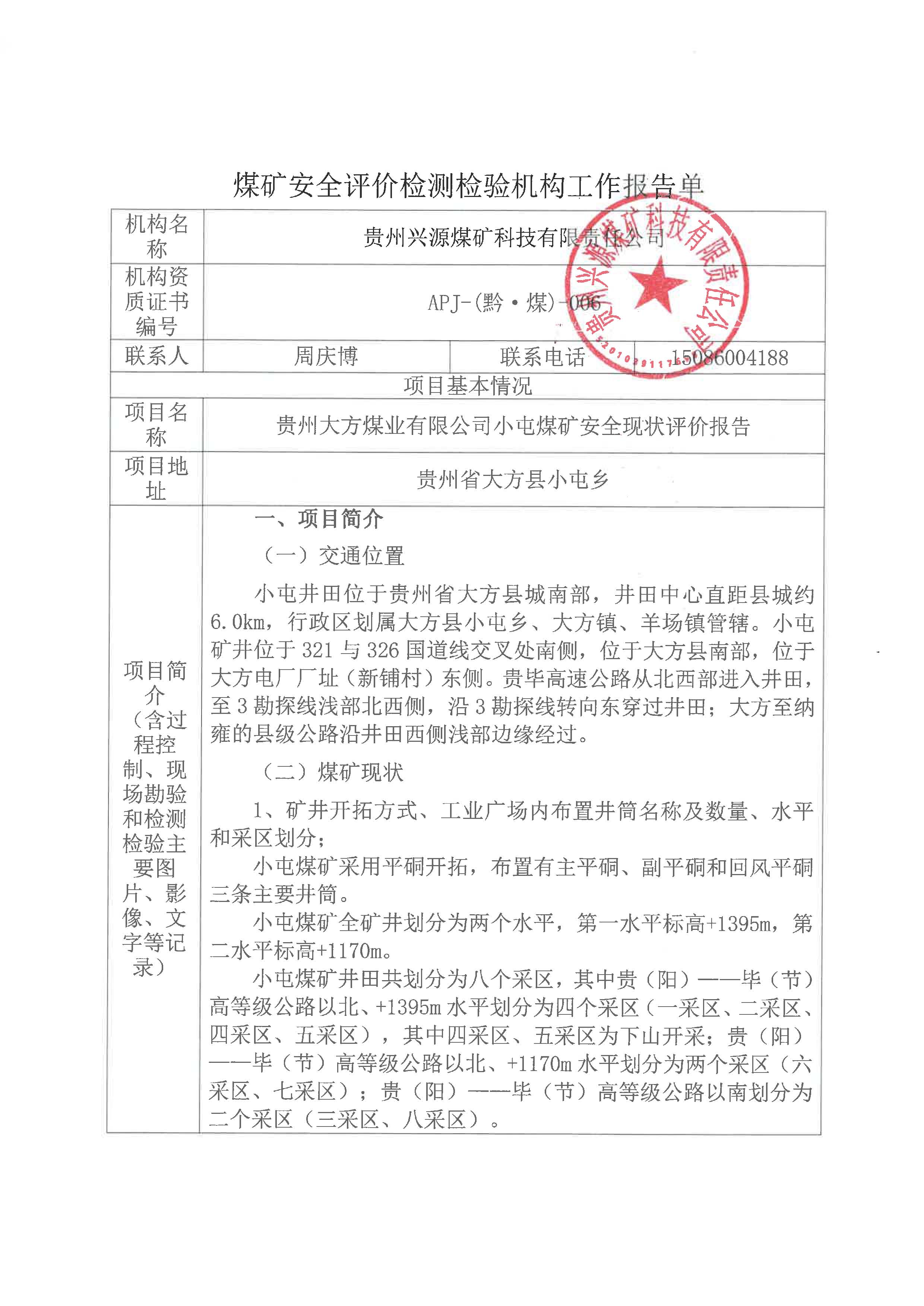 煤礦安全評價檢測檢驗機構(gòu)工作報告單【貴州大方煤業(yè)有限公司小屯煤礦安全現(xiàn)狀評價報告】