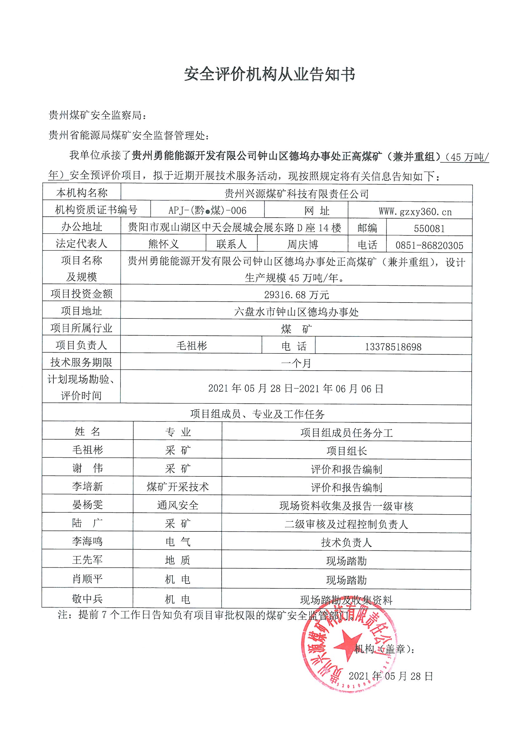 安全評價機構從業告知書(貴州勇能能源開發有限公司鐘山區德塢辦事處正高煤礦(兼并重組)(45萬噸年)安全預評價)