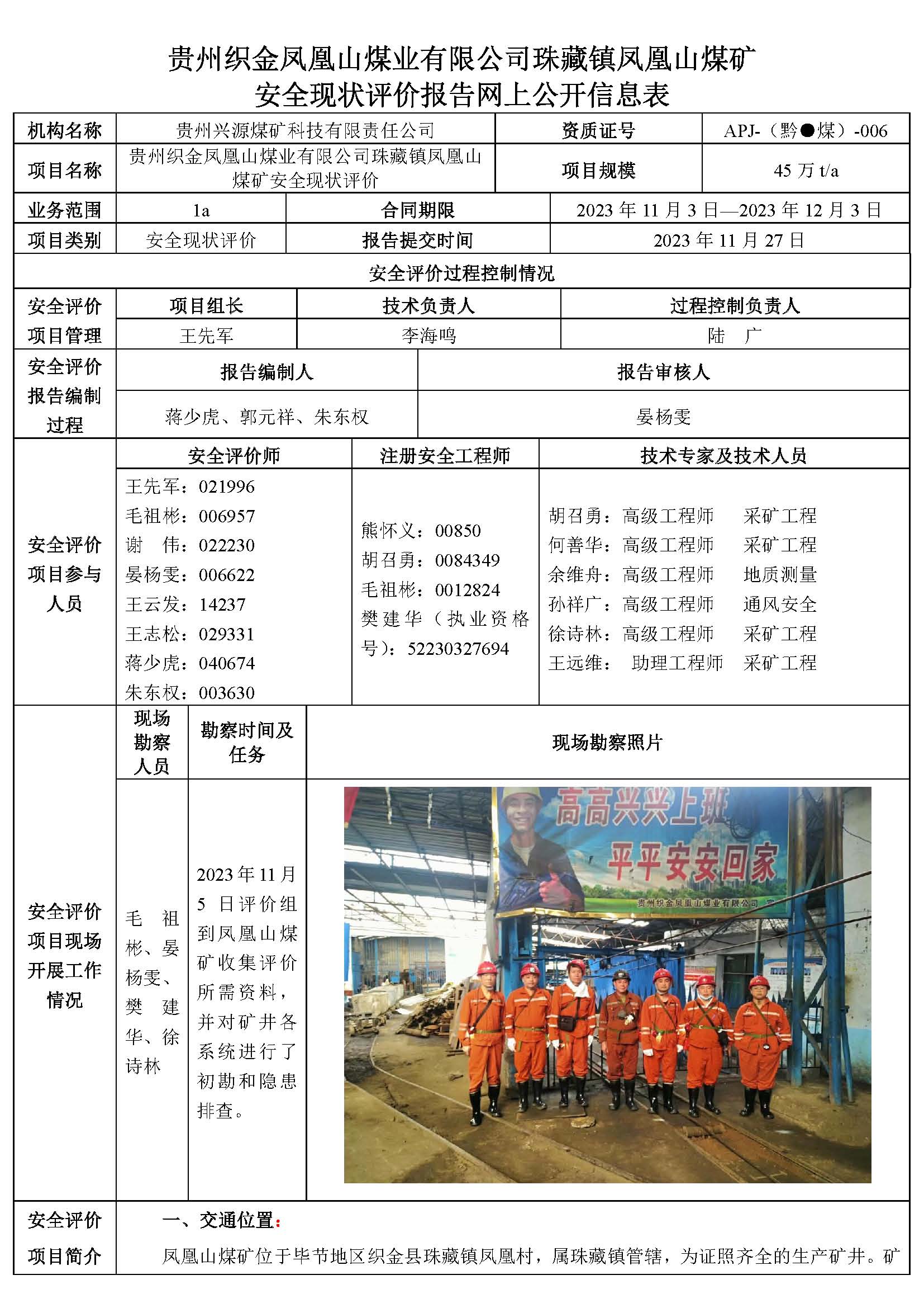 貴州織金鳳凰山煤業有限公司珠藏鎮鳳凰山煤礦 安全現狀評價報告網上公開信息表