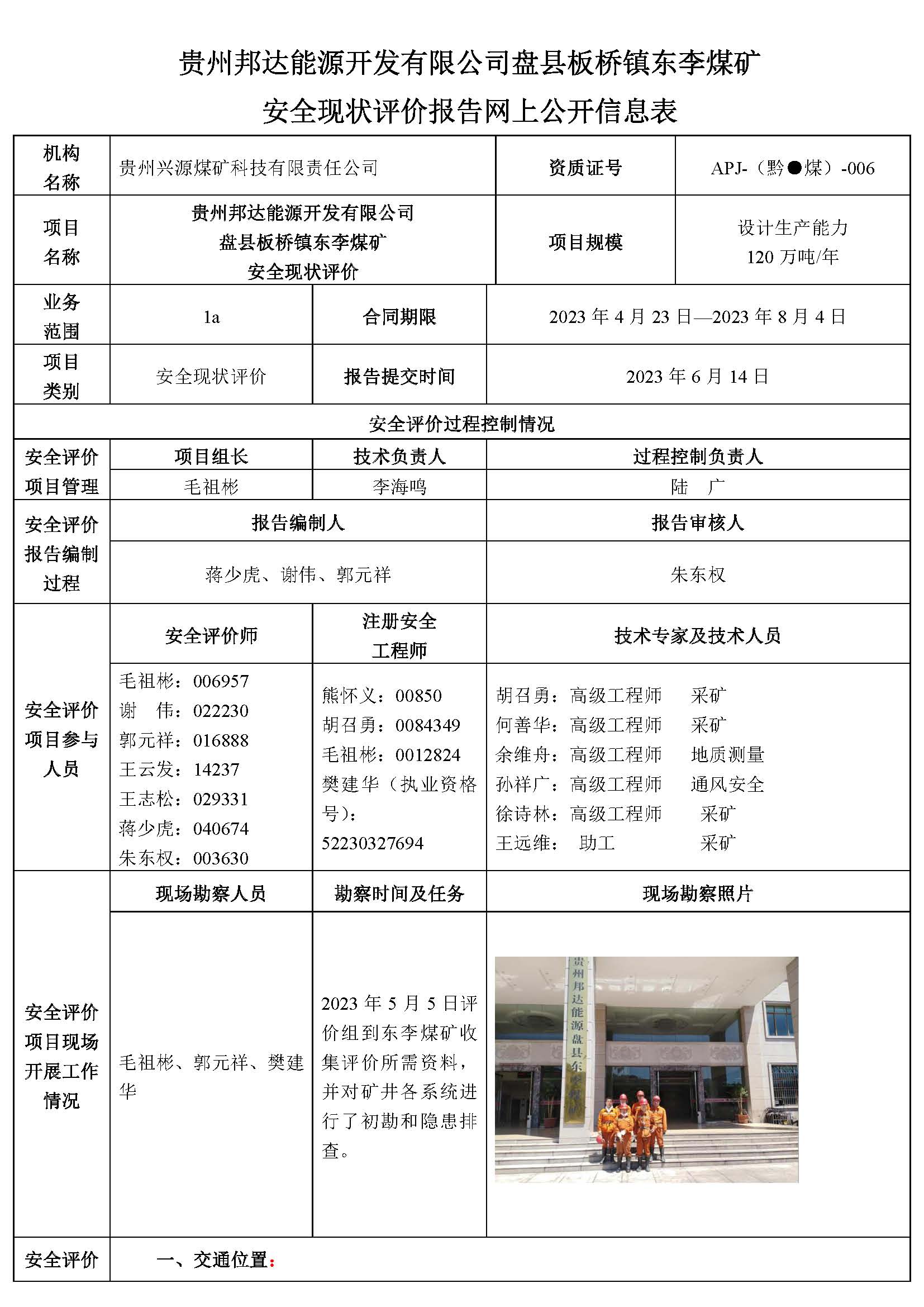 貴州邦達能源開發有限公司盤縣板橋鎮東李煤礦 安全現狀評價報告網上公開信息表