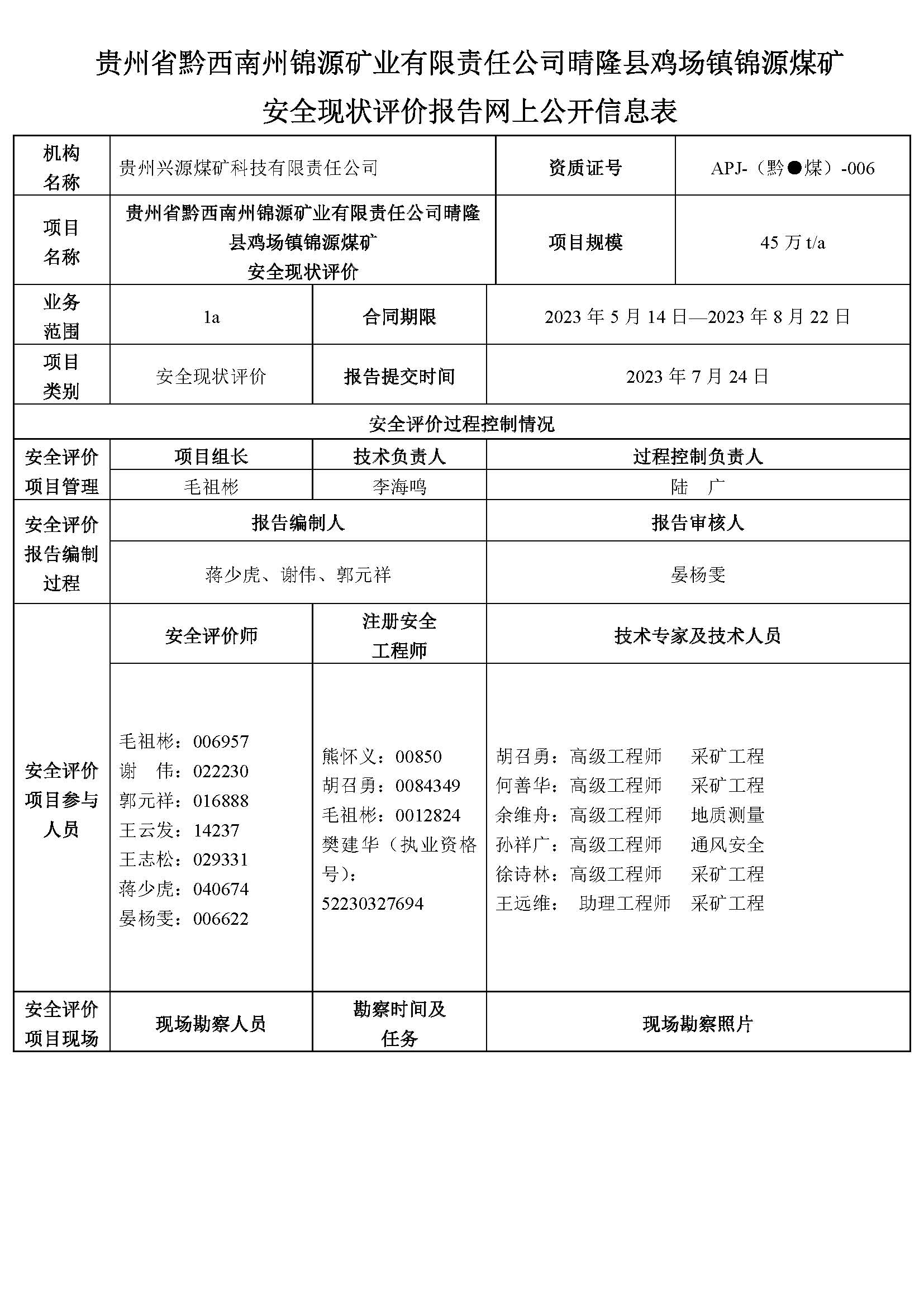 貴州省黔西南州錦源礦業有限責任公司晴隆縣雞場鎮錦源煤礦 安全現狀評價報告網上公開信息表