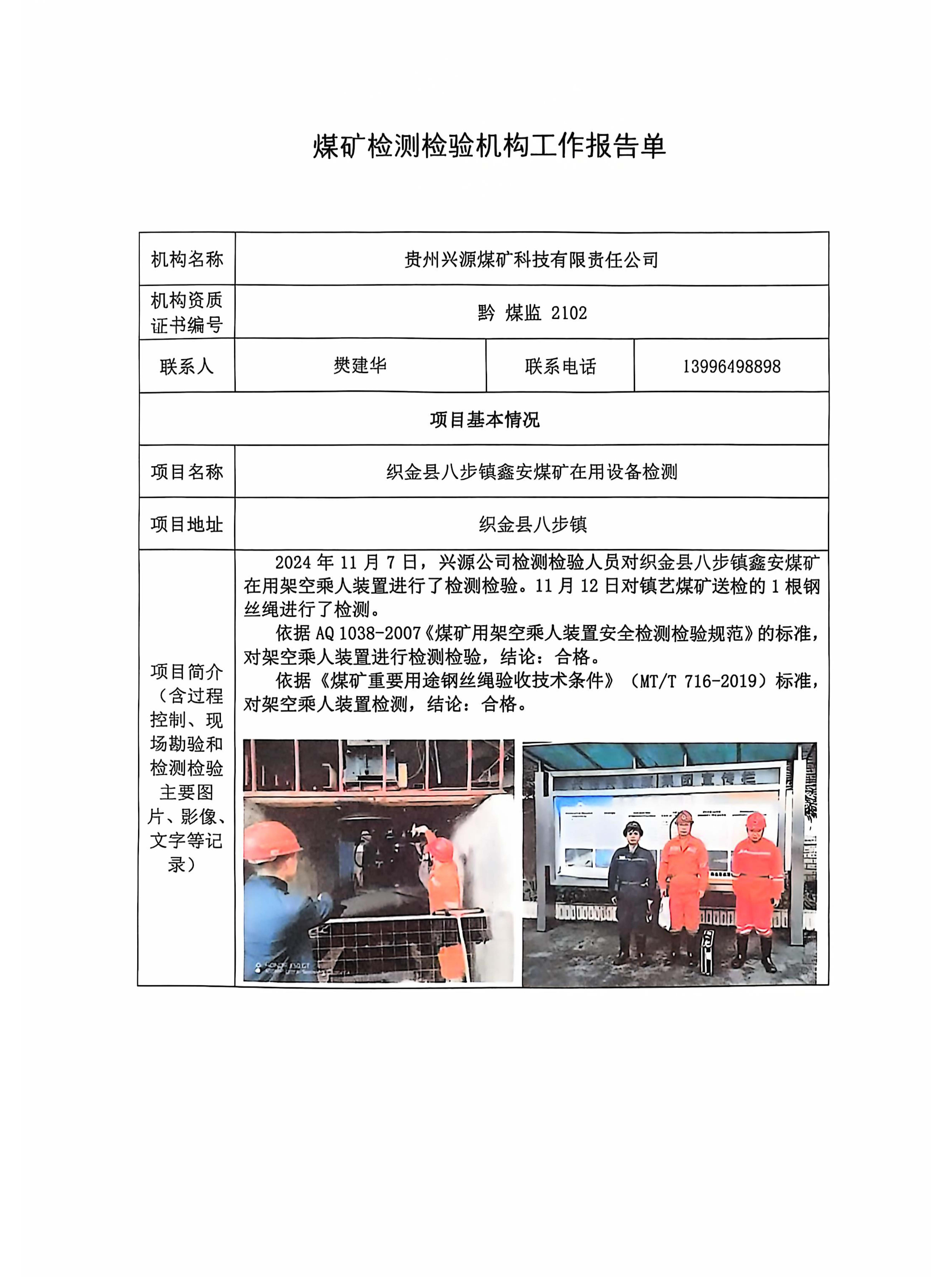 煤礦檢測檢驗機構工作報告單【織金縣八步鎮鑫安煤礦在用設備檢測】