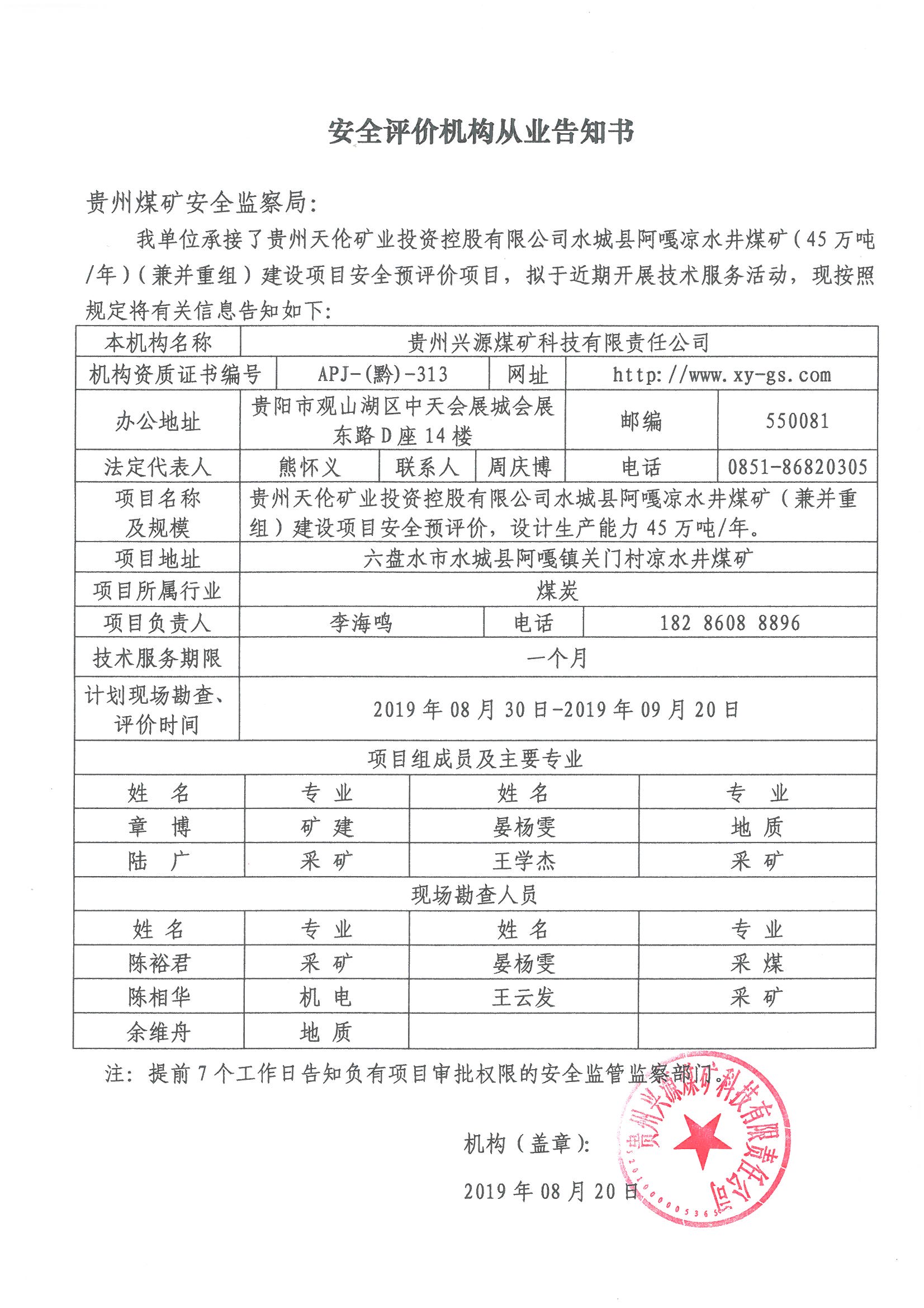 安全評價機構從業告知書[貴州天倫礦業投資控股有限公司水城縣阿嘎涼水井煤礦]