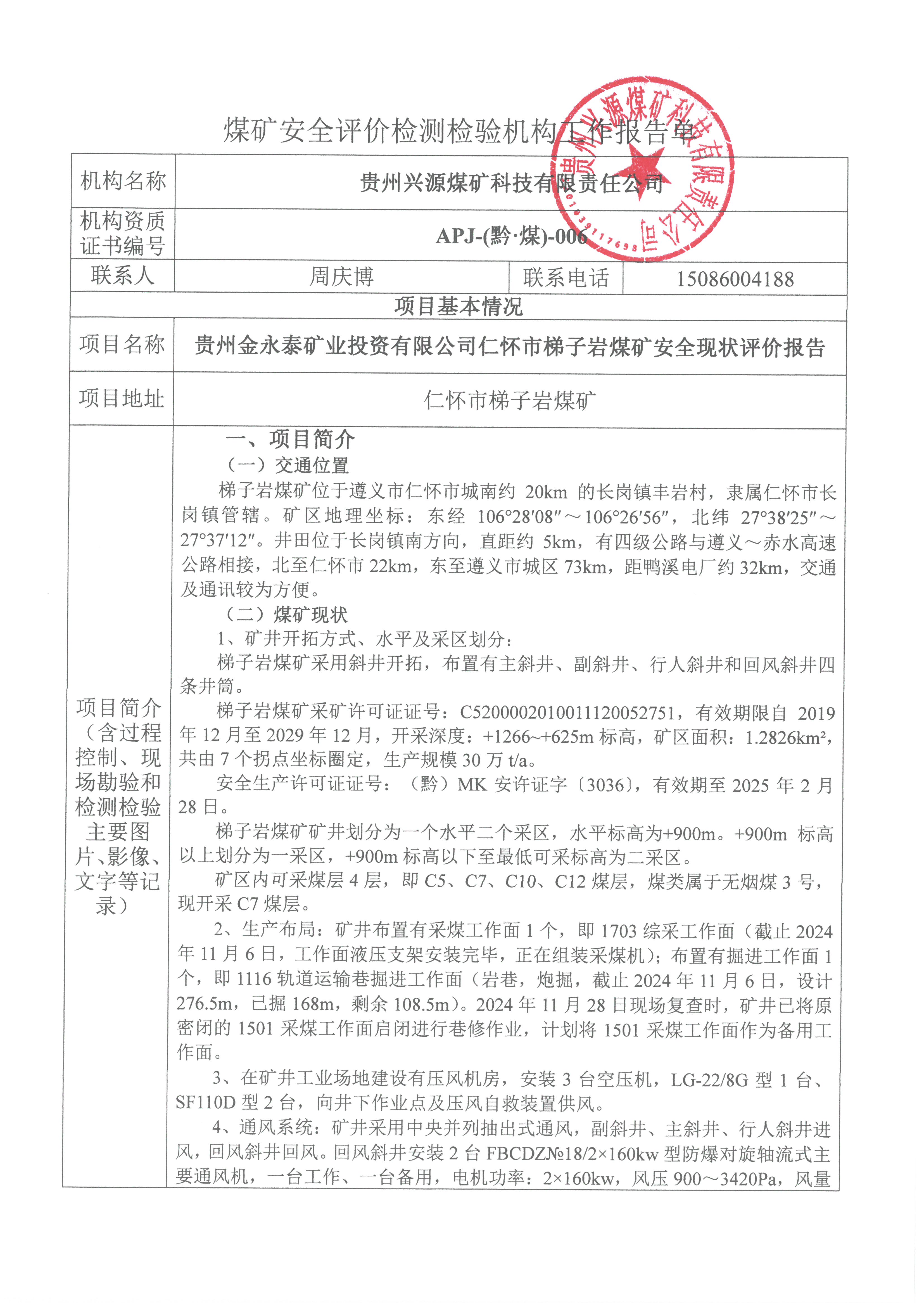 煤礦安全評價檢測檢驗機構(gòu)工作報告單【貴州金永泰礦業(yè)投資有限公司仁懷市梯子巖煤礦安全現(xiàn)狀評價報告】