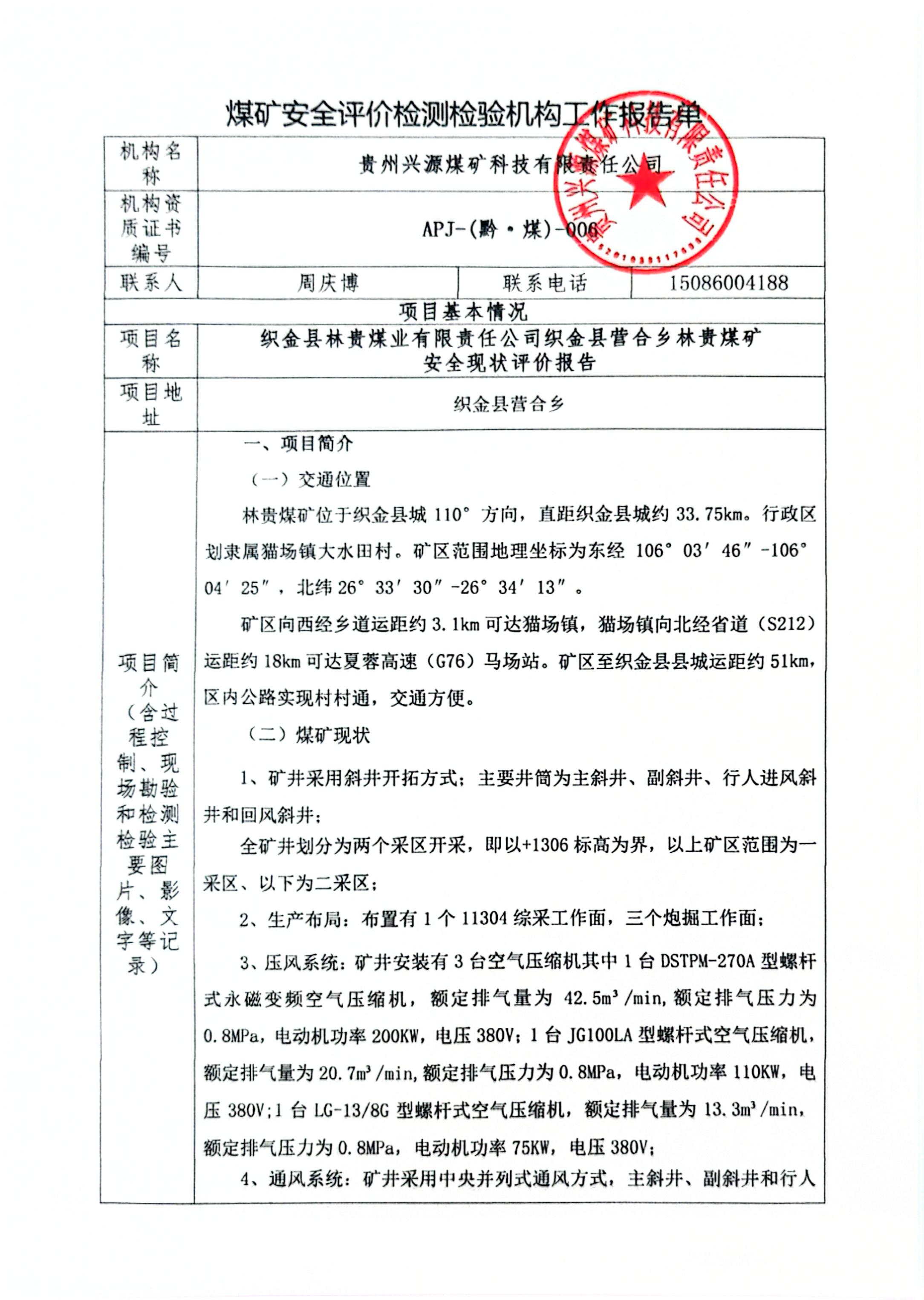 煤礦安全評價檢測檢驗機構工作報告單【織金縣林貴煤業有限責任公司織金縣營合鄉林貴煤礦 安全現狀評價報告】