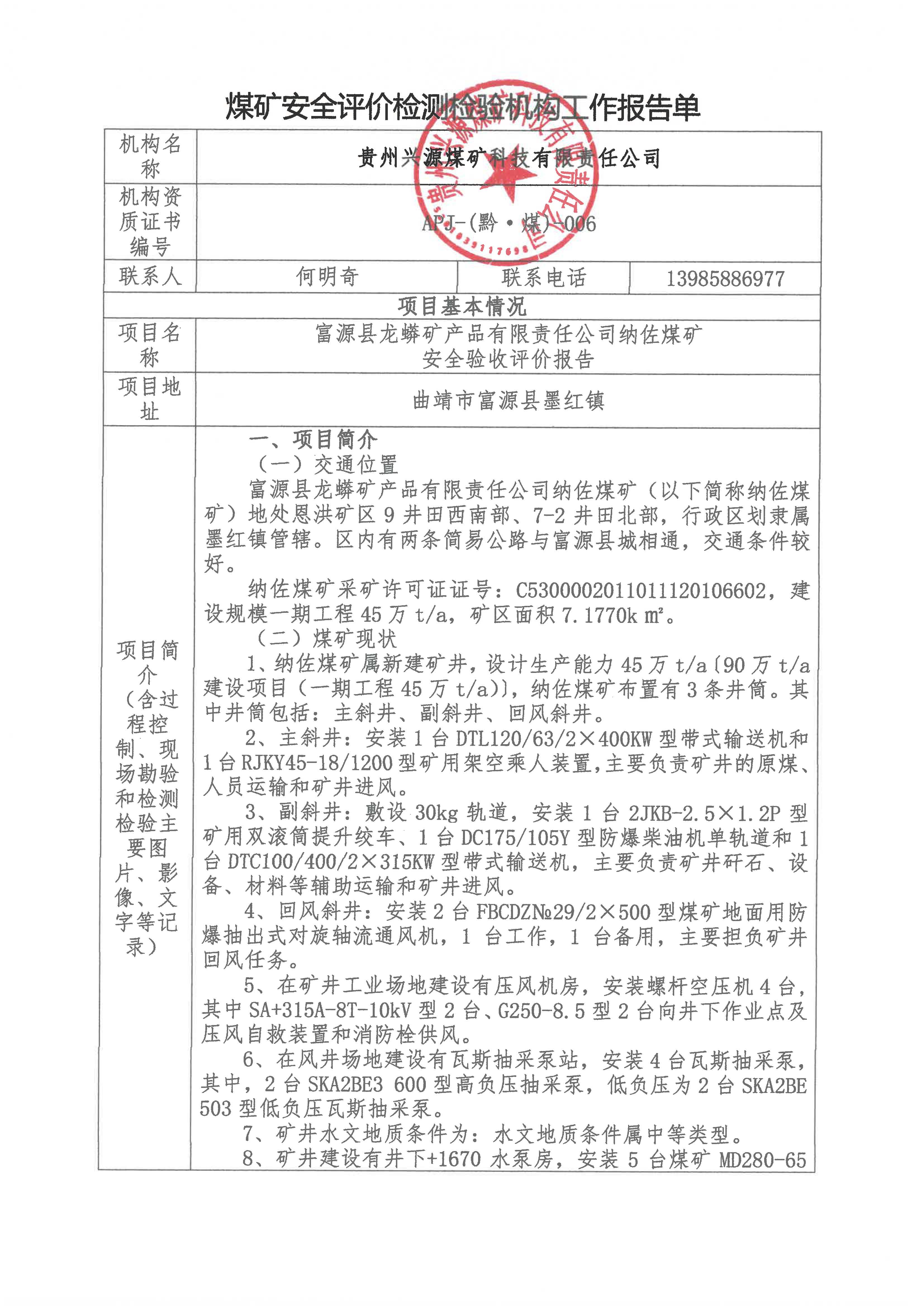 煤礦安全評價檢測檢驗機構(gòu)工作報告單【富源縣龍蟒礦產(chǎn)品有限責(zé)任公司納佐煤礦安全驗收評價報告】