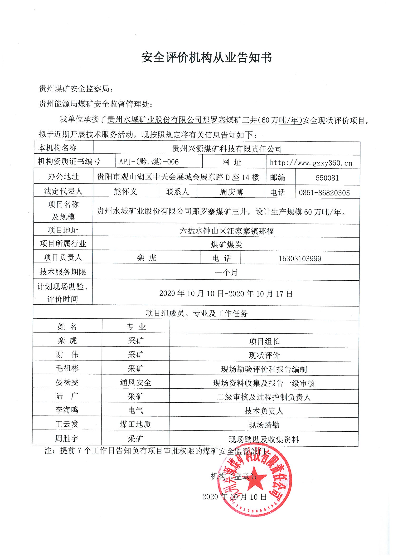 安全評價機構從業告知書(貴州水城礦業股份有限公司那羅寨煤礦三井)