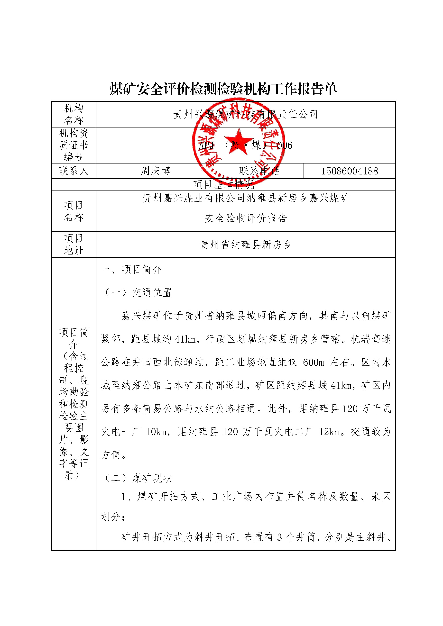 煤礦安全評價檢測檢驗機構工作報告單【貴州嘉興煤業有限公司納雍縣新房鄉嘉興煤礦安全驗收評價報告】
