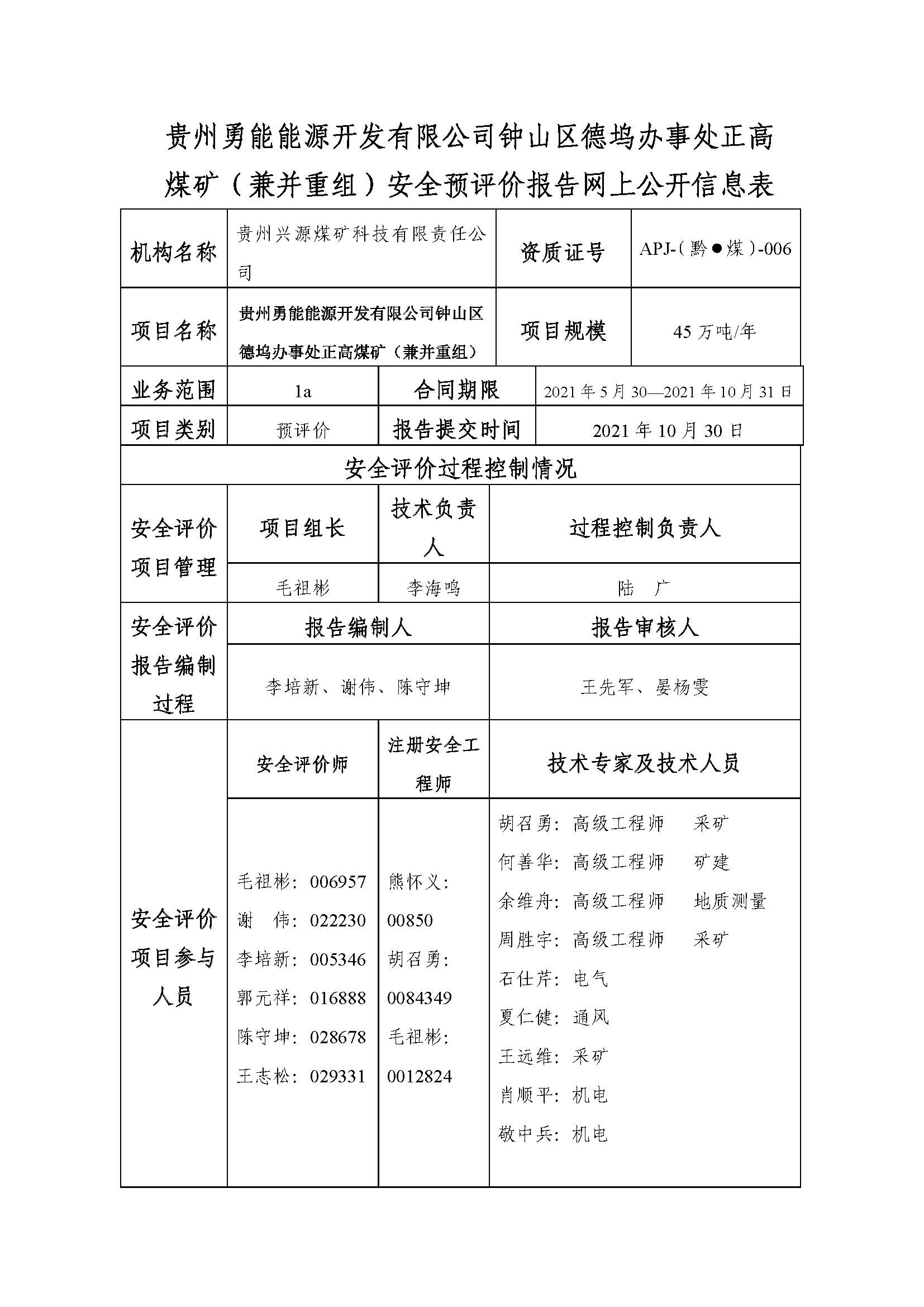 貴州勇能能源開發(fā)有限公司鐘山區(qū)德塢辦事處正高煤礦(兼并重組)安全預評價報告網(wǎng)上公開信息表