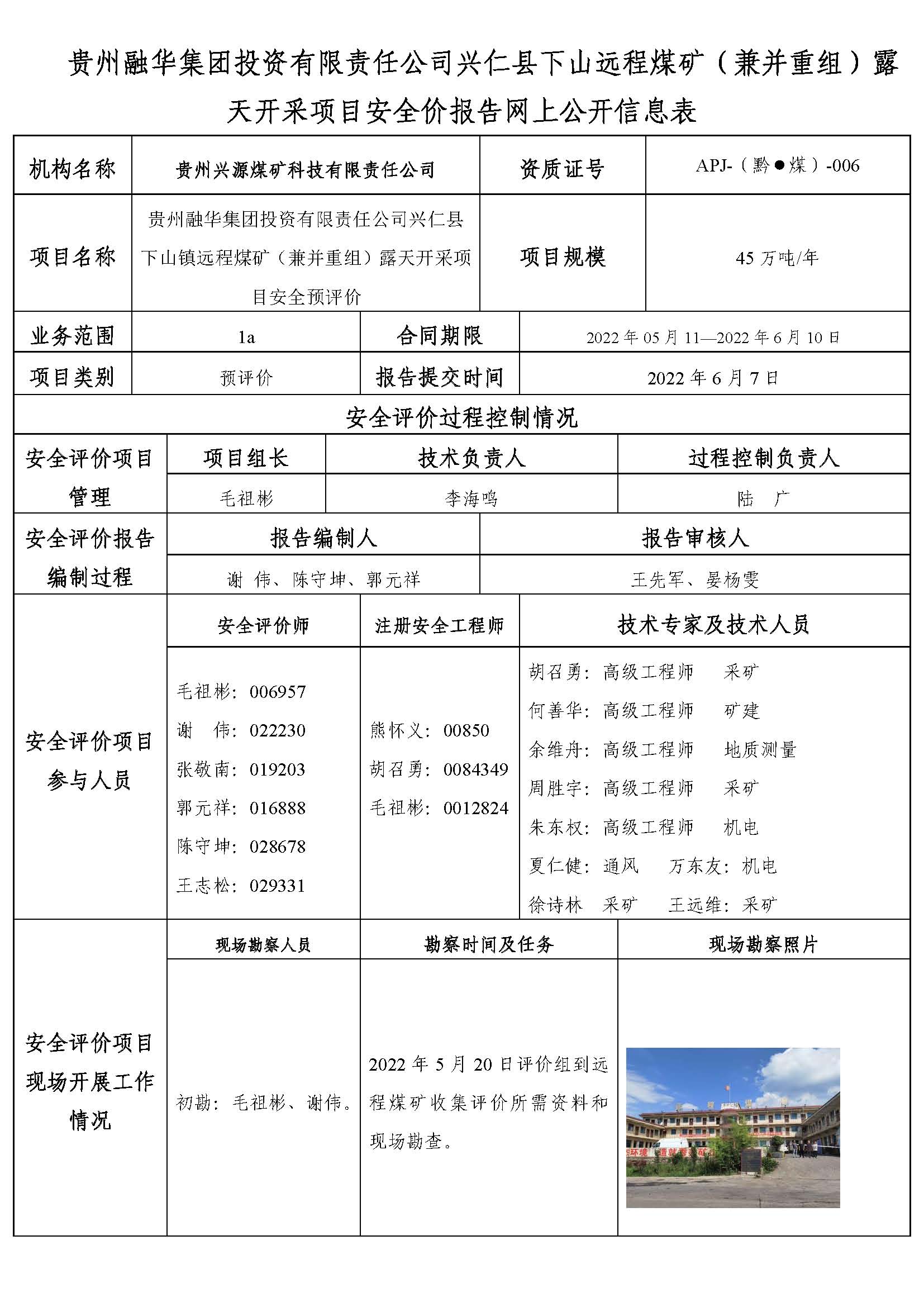 貴州融華集團投資有限責任公司興仁縣下山遠程煤礦(兼并重組)露天開采項目安全價報告網(wǎng)上公開信息表