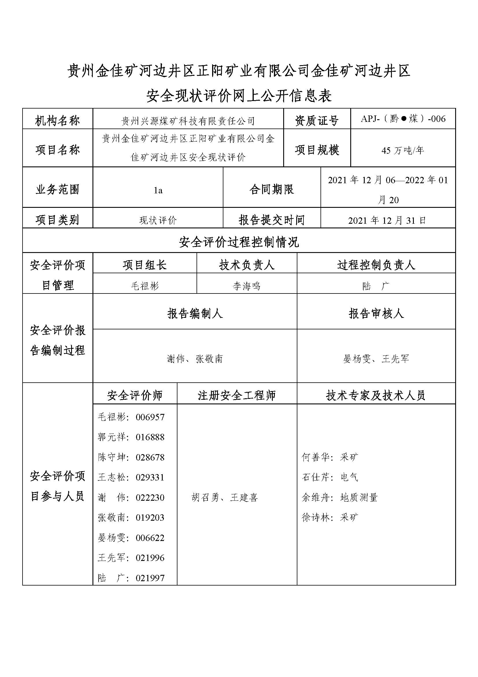 貴州金佳礦河邊井區正陽礦業有限公司金佳礦河邊井區安全現狀評價網上公開信息表