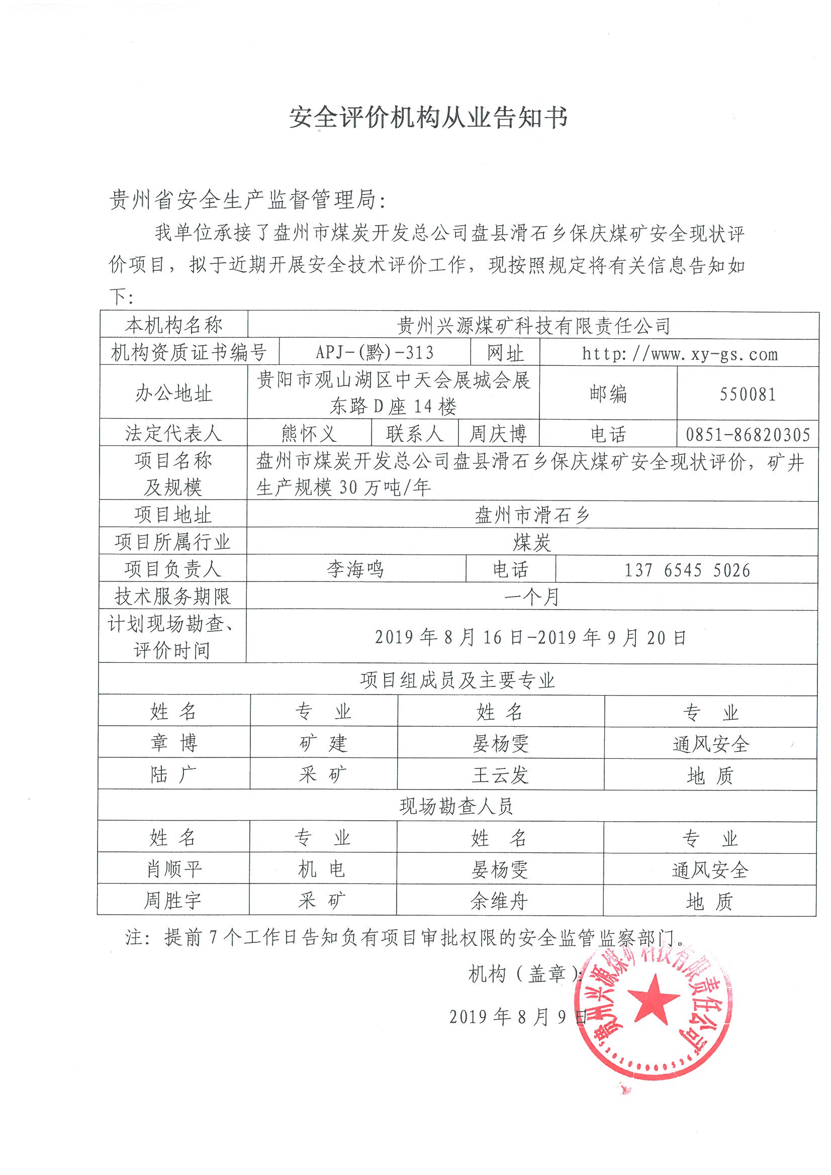 安全評價機構從業告知書[盤州市煤炭開發總公司盤縣滑石鄉保慶煤礦]