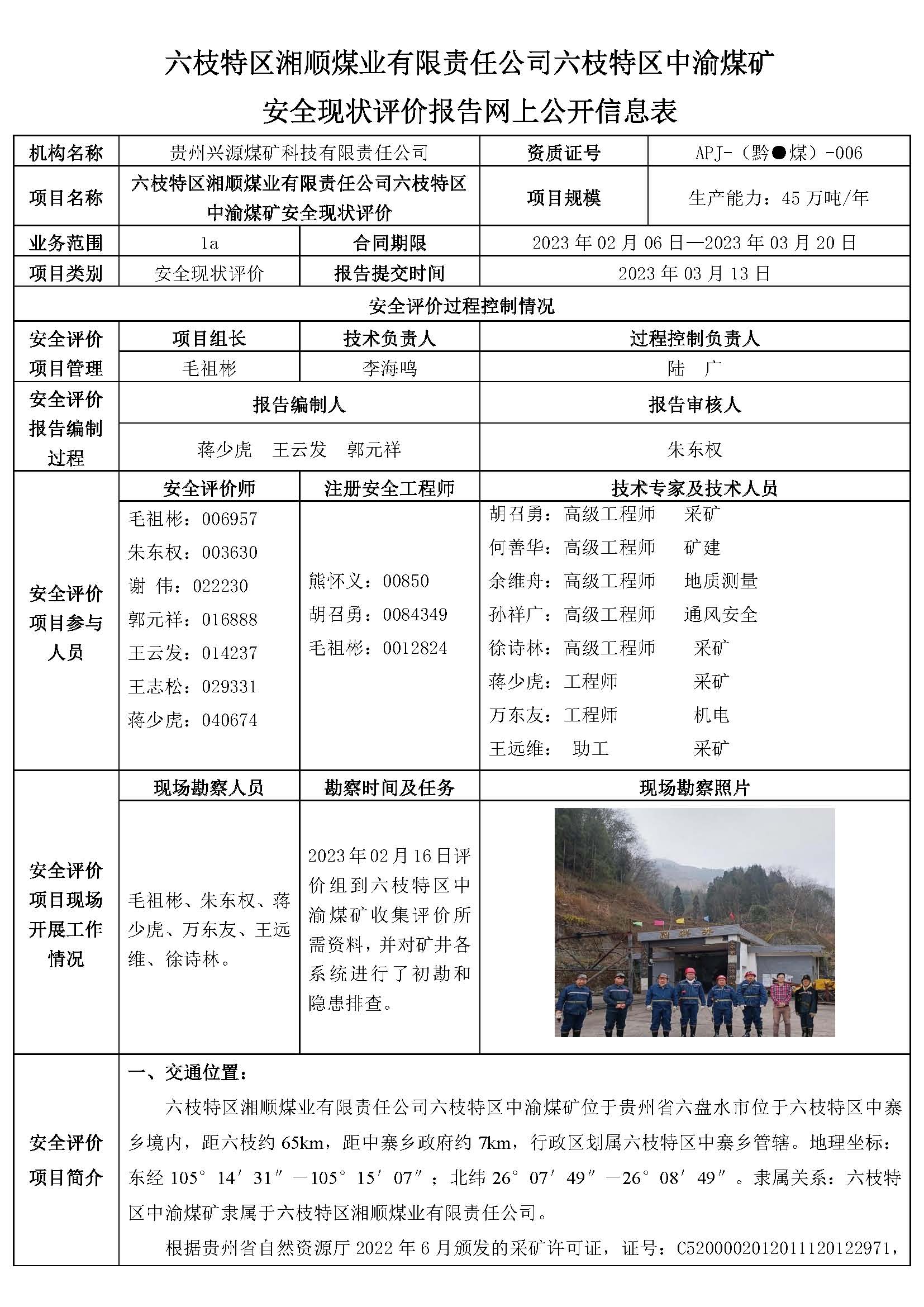 六枝特區湘順煤業有限責任公司六枝特區中渝煤礦安全現狀評價報告網上公開信息表