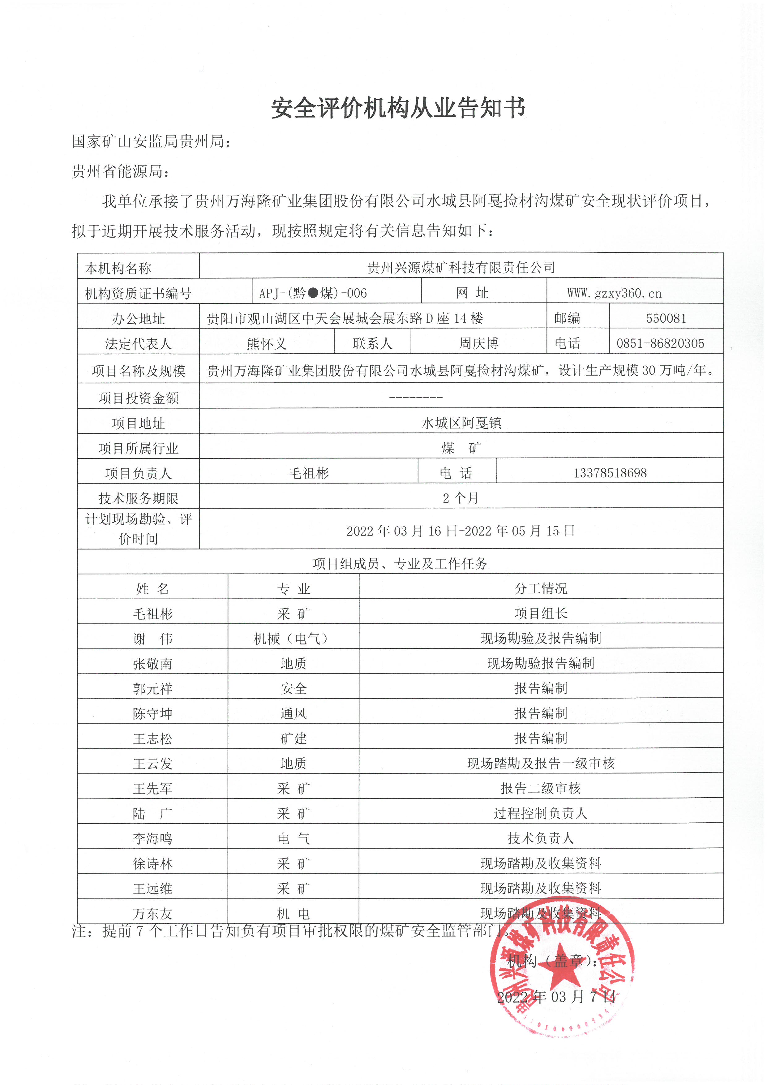 安全評價機構從業告知書(貴州萬海隆礦業集團股份有限公司水城縣阿戛撿材溝煤礦安全現狀評價)