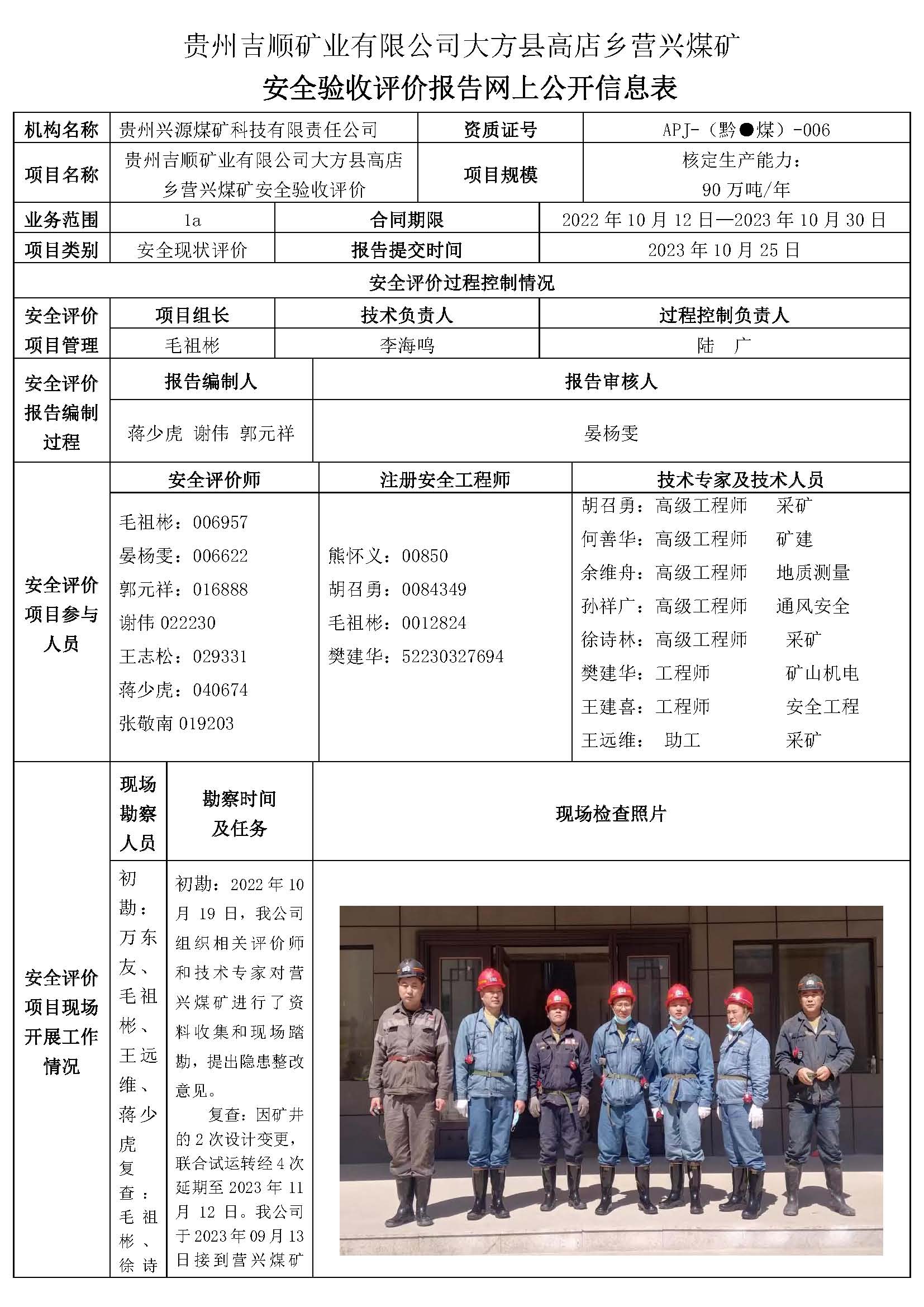 貴州吉順礦業有限公司大方縣高店鄉營興煤礦安全驗收評價報告網上公開信息表