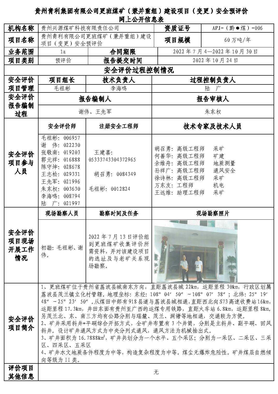貴州青利集團(tuán)有限公司更班煤礦(兼并重組)建設(shè)項(xiàng)目(變更)安全預(yù)評(píng)價(jià)網(wǎng)上公開信息表