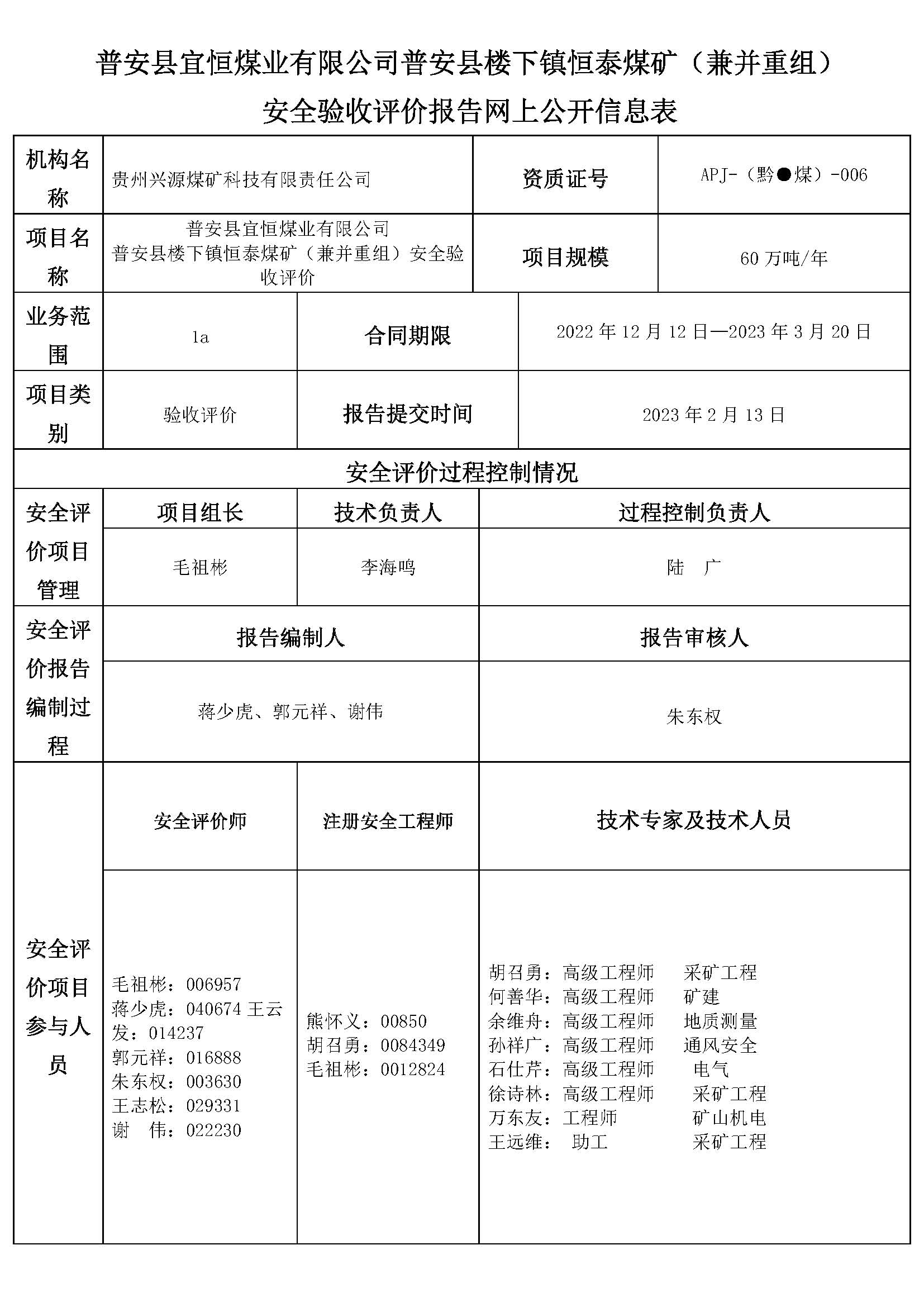 普安縣宜恒煤業(yè)有限公司普安縣樓下鎮(zhèn)恒泰煤礦(兼并重組) 安全驗(yàn)收評(píng)價(jià)報(bào)告網(wǎng)上公開信息表