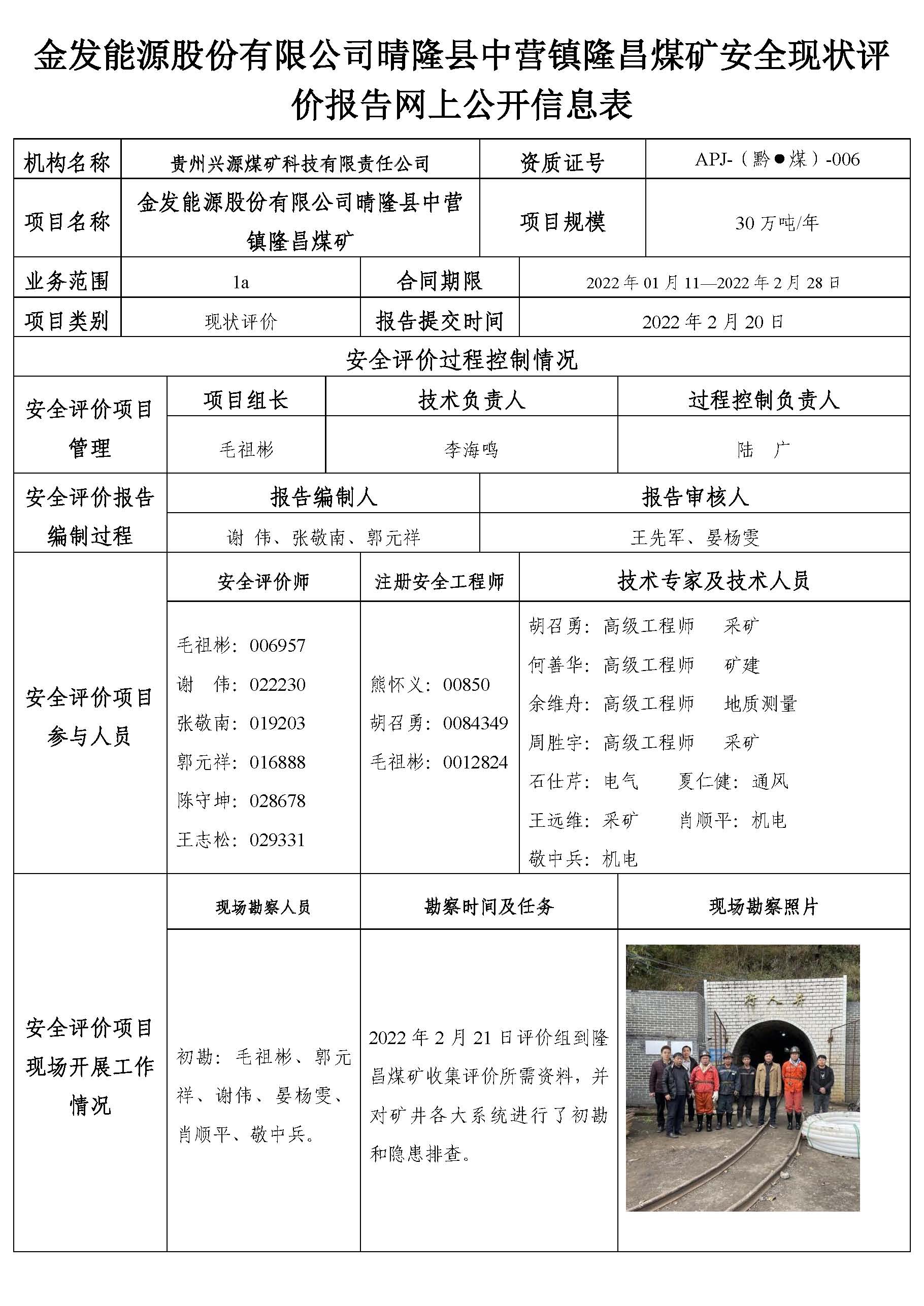 金發能源股份有限公司晴隆縣中營鎮隆昌煤礦安全現狀評價報告網上公開信息表