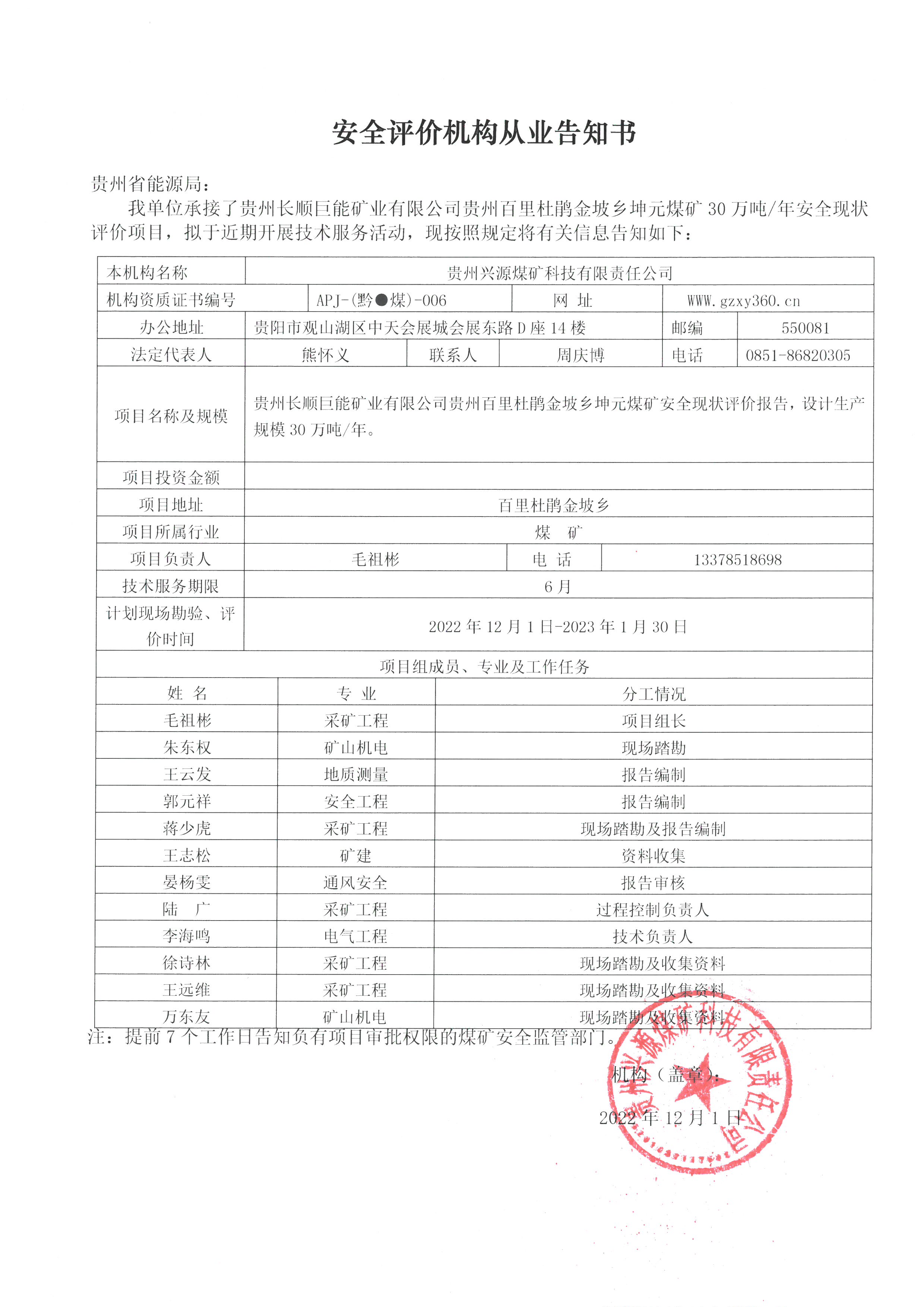 安全評價機構從業告知書【貴州長順巨能礦業有限公司貴州百里杜鵑金坡鄉坤元煤礦】