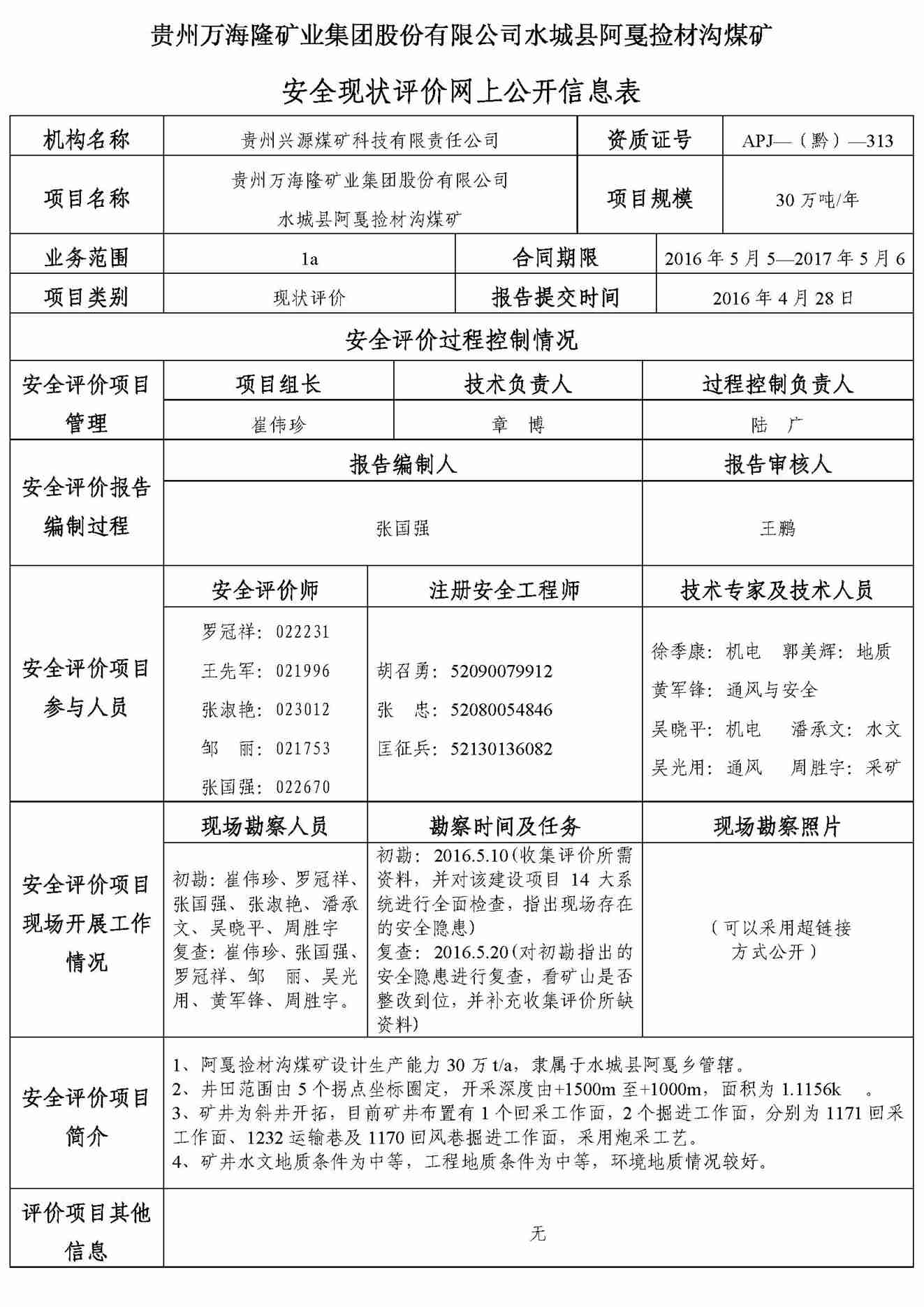 貴州萬海隆礦業集團股份有限公司水城縣阿戛撿材溝煤礦安全現狀評價網上公開信息表