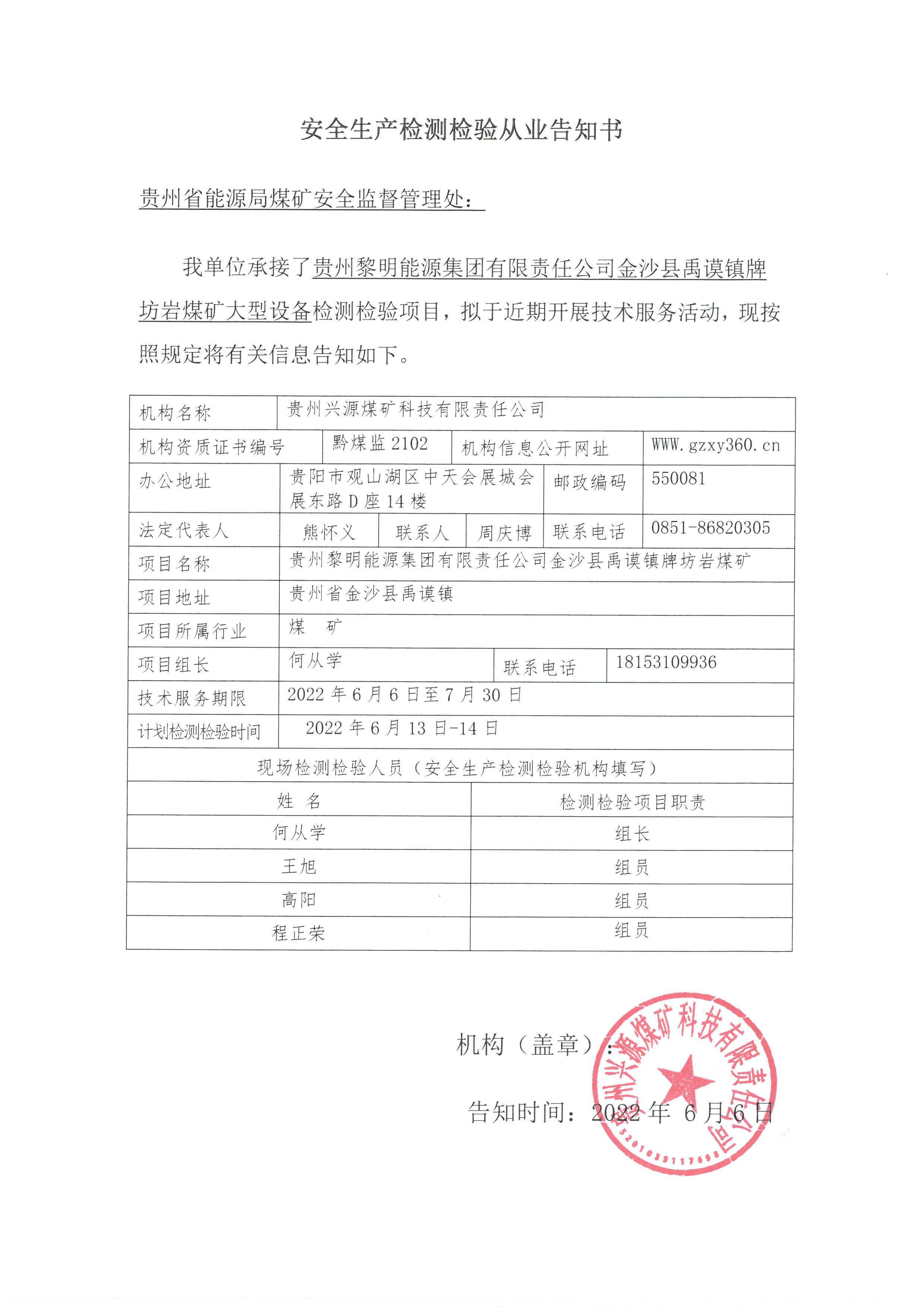 安全生產檢測檢驗從業告知書【貴州黎明能源集團有限責任公司金沙縣禹謨鎮牌坊巖煤礦】