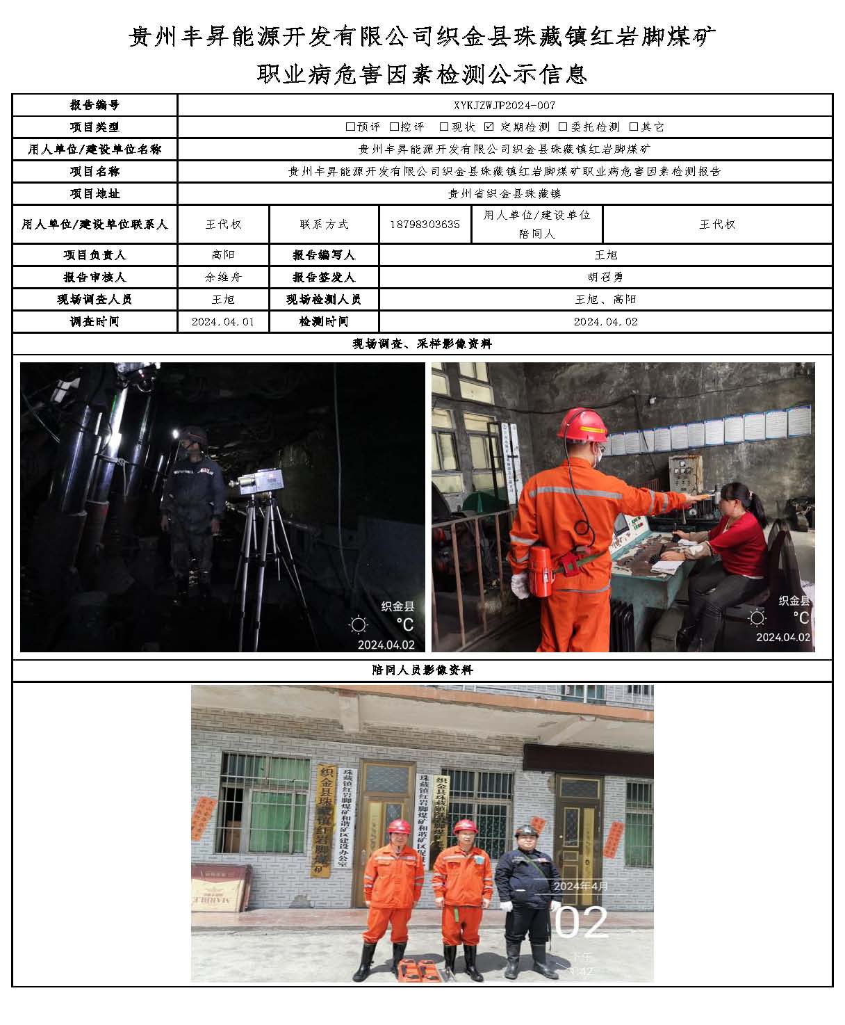 貴州豐昇能源開發有限公司織金縣珠藏鎮紅巖腳煤礦 職業病危害因素檢測公示信息