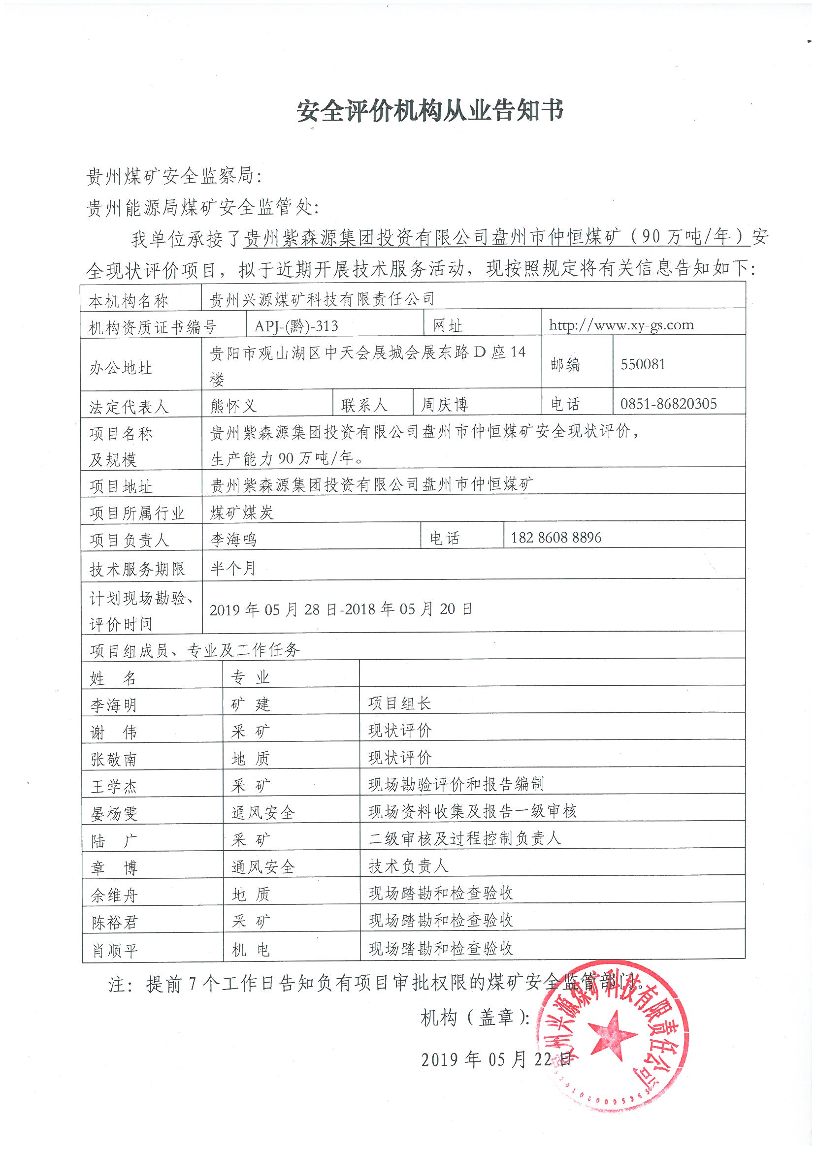 安全評價(jià)機(jī)構(gòu)從業(yè)告知書【貴州紫森源集團(tuán)投資有限公司盤州市仲恒煤礦】
